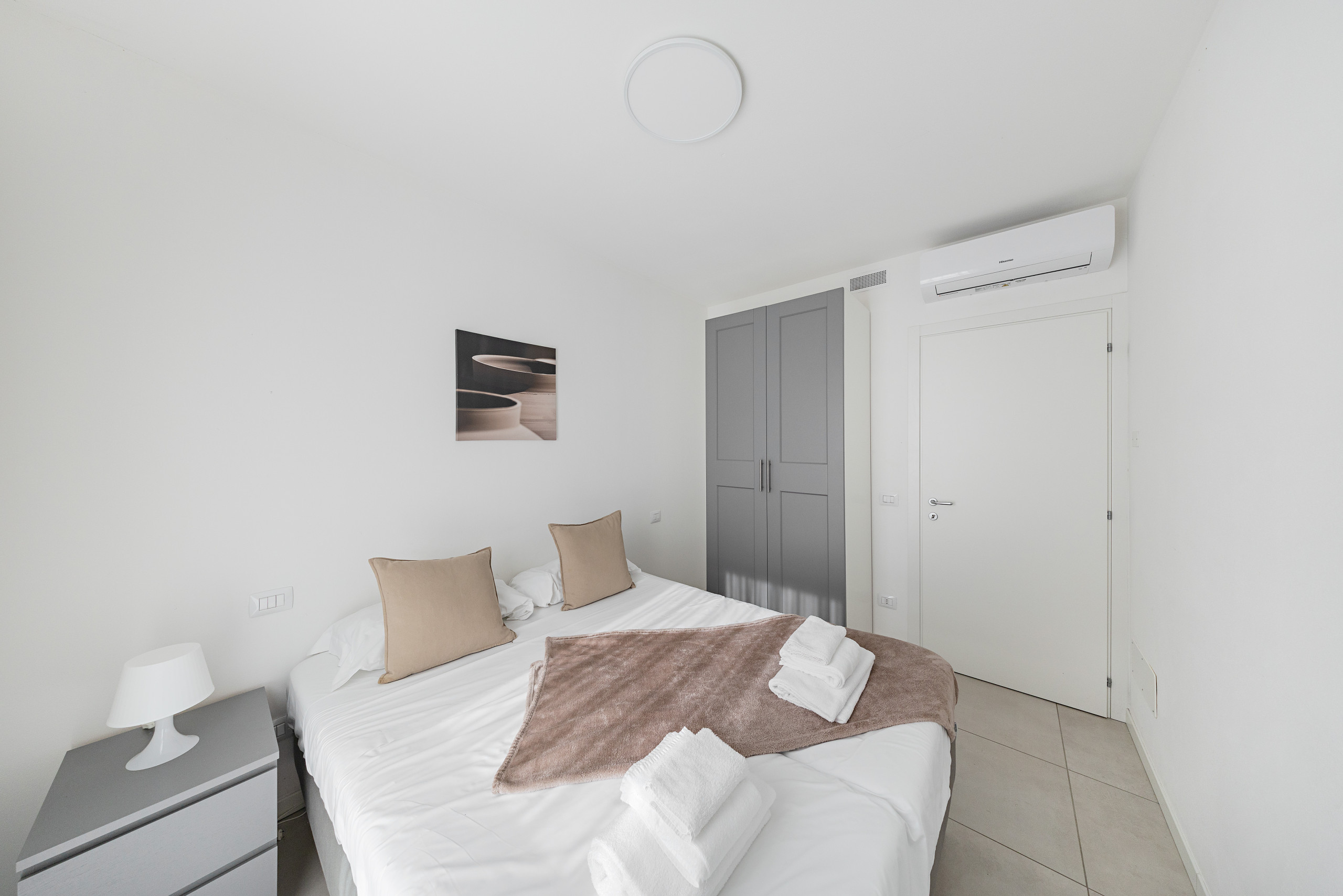 La zona notte si compone di due camere, la prima dotata di letto matrimoniale, armadio e balcone privato, mentre la seconda con letto matrimoniale e un armadio.