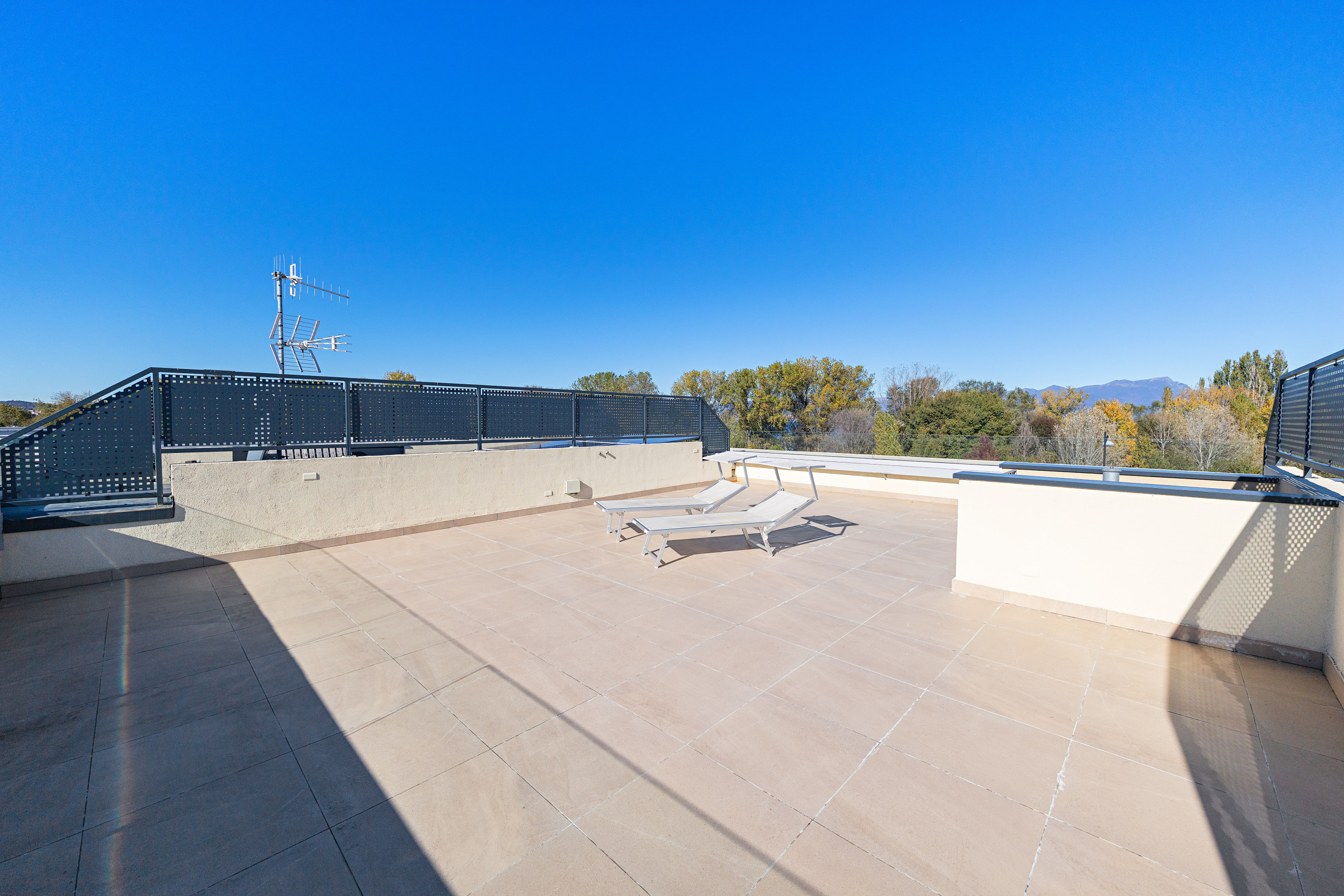 Dal soggiorno si accede ad un piccolo balcone che con una scala permette l’accesso alla terrazza solarium privata sul tetto del residence.
