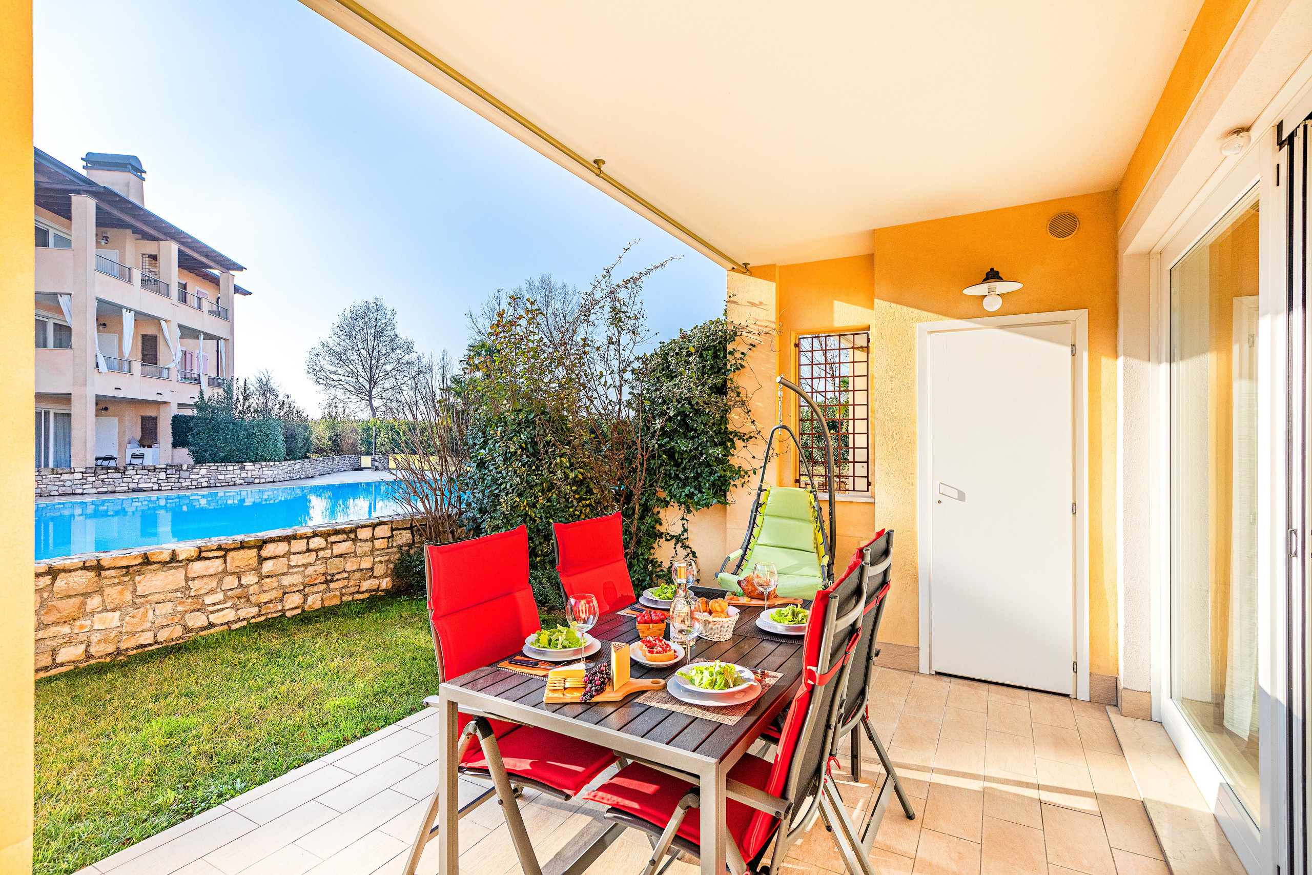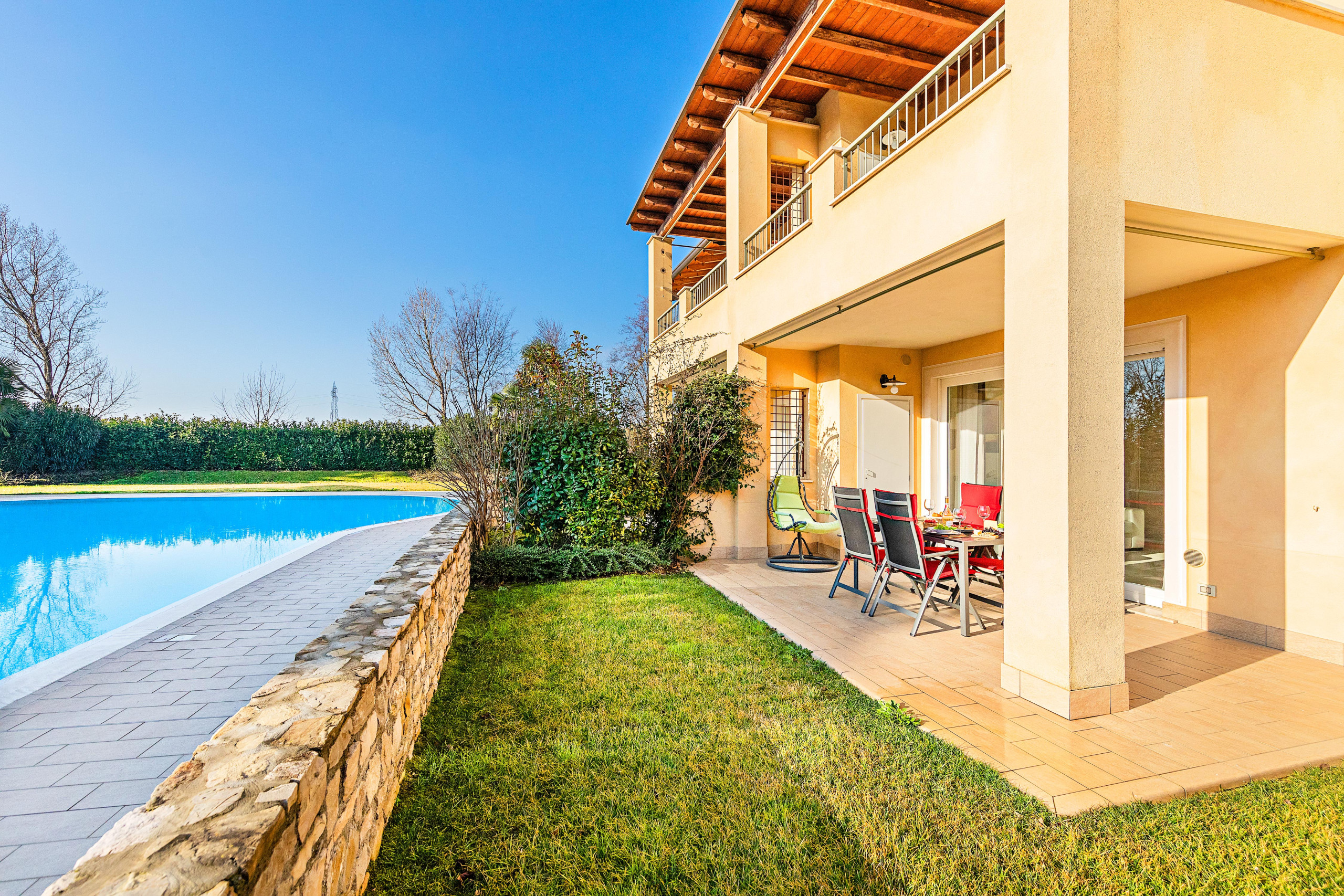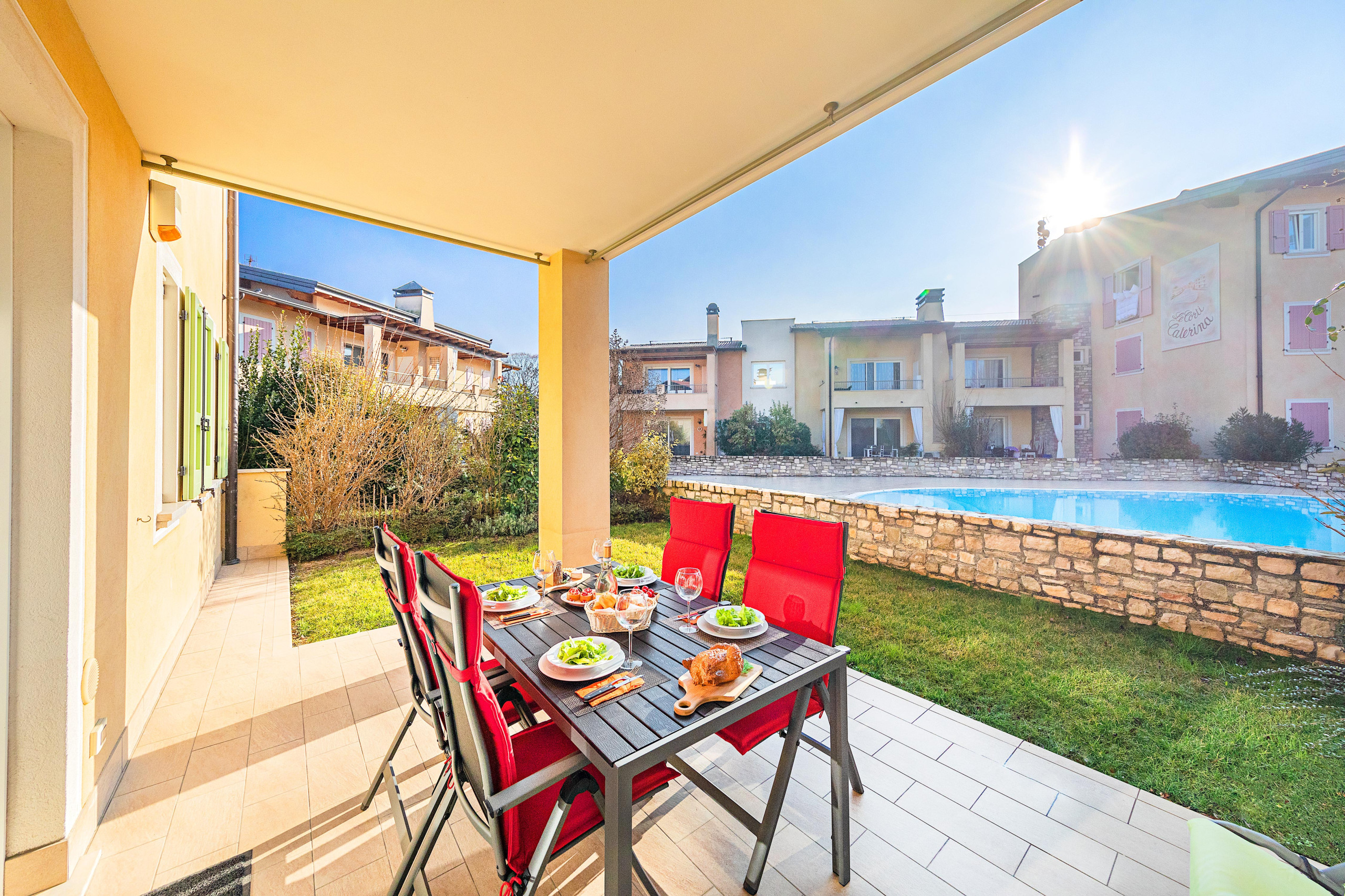 Moderno appartamento con due camere da letto, al piano terra con doppio giardino fronte e retro, situato all’interno di un nuovo complesso residenziale a Lonato del Garda dotato di grande piscina.