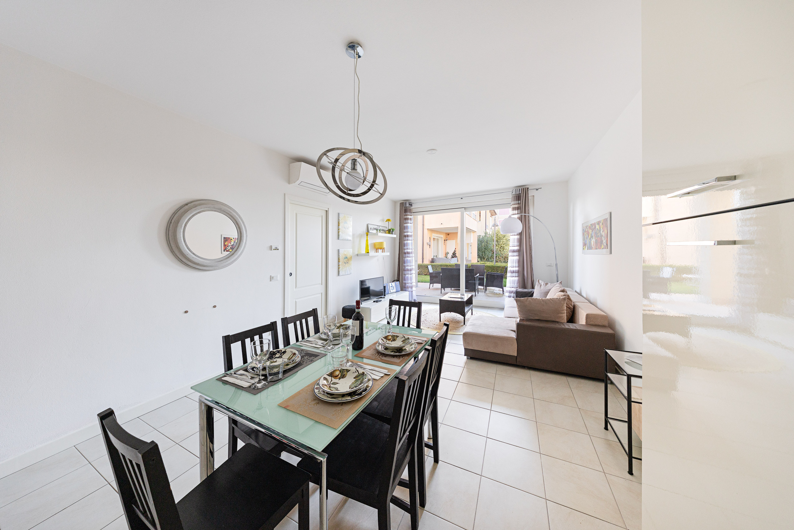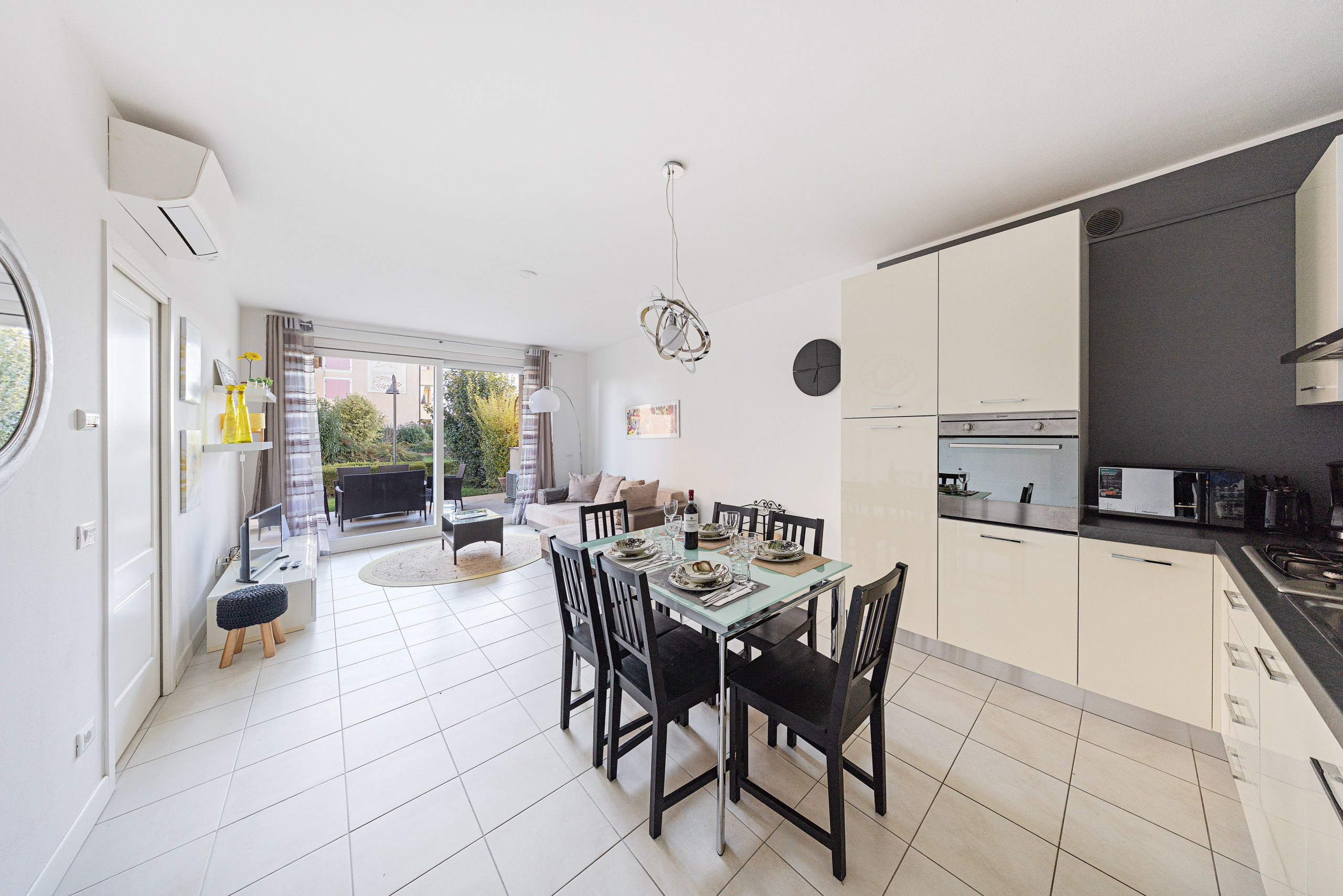Il soggiorno affaccia sul portico coperto privato dotato di tavolo e sedie per pranzi e colazioni all'aria aperta e sul giardino privato.