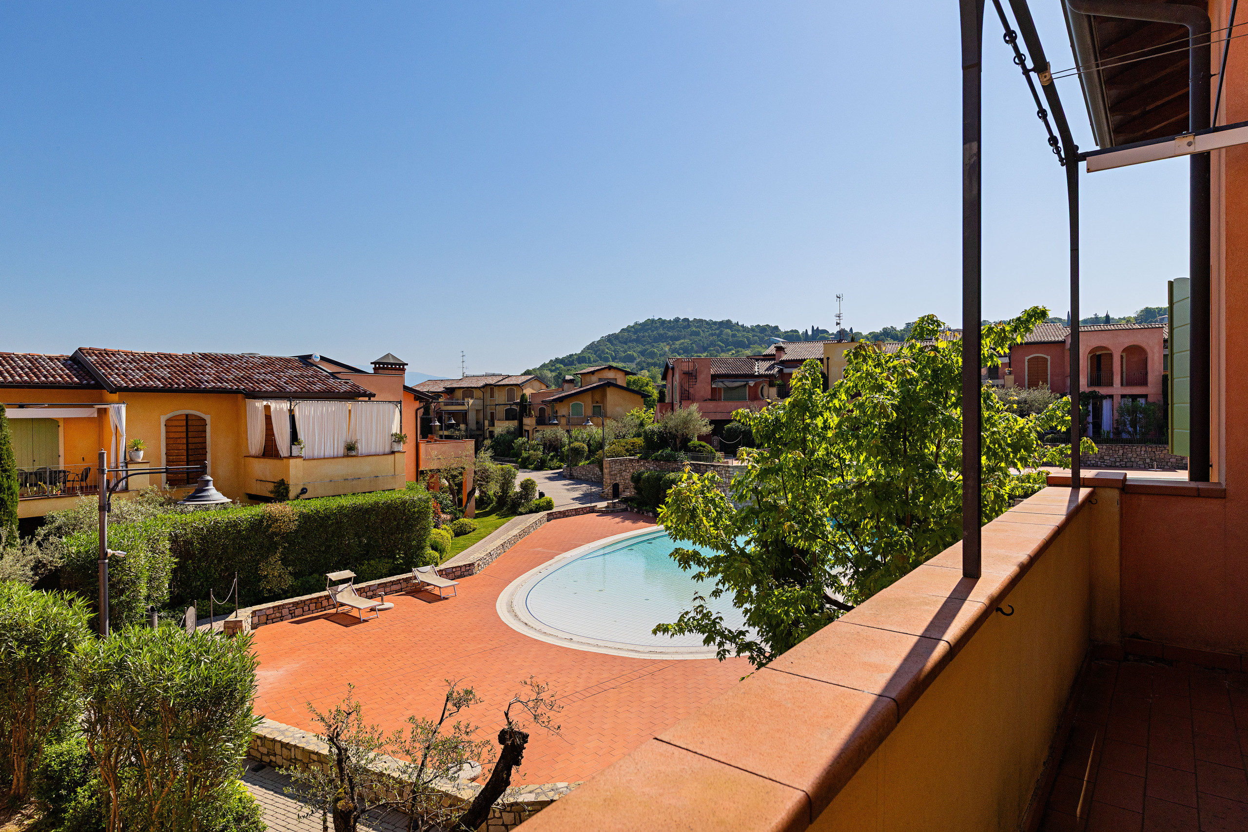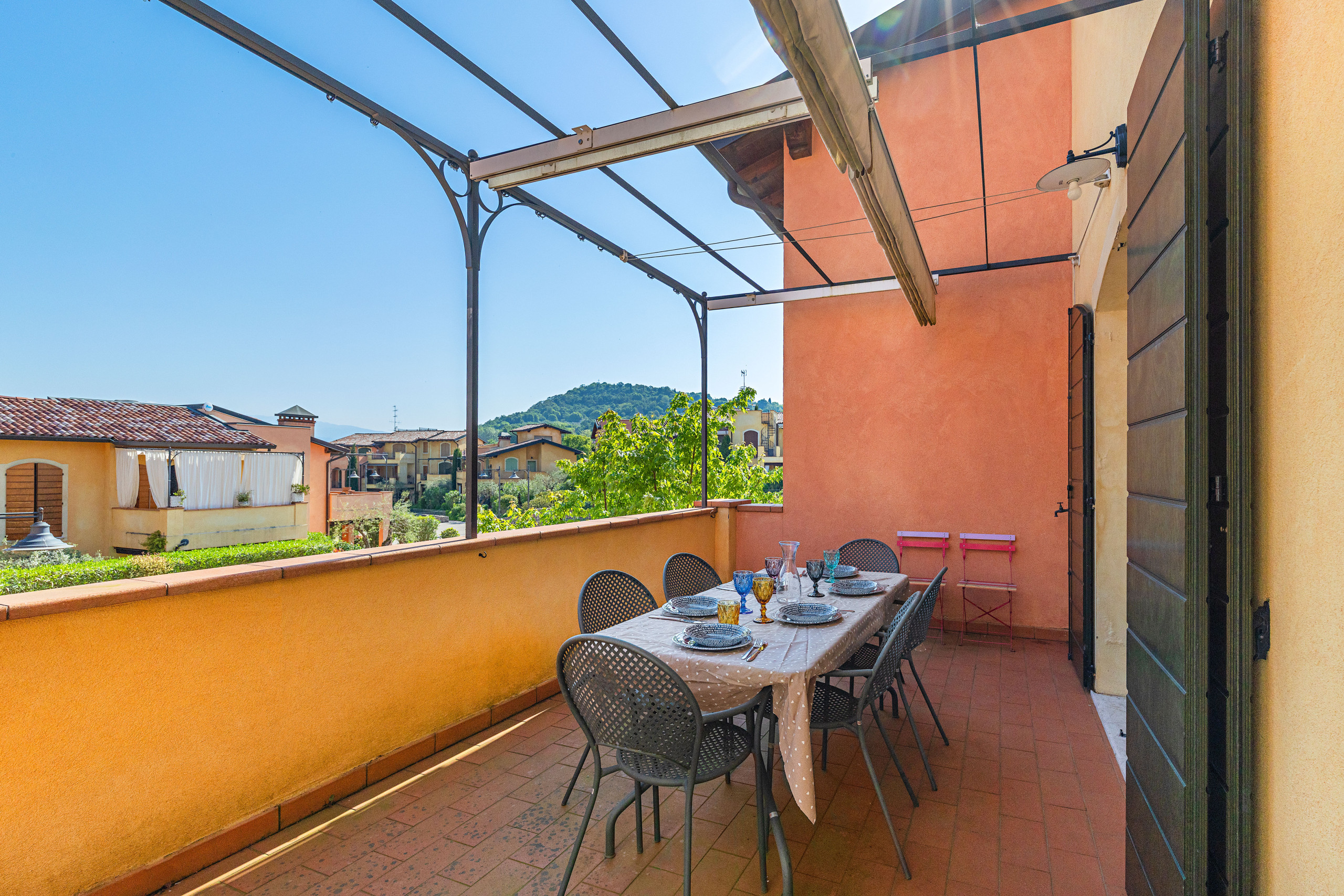 Dal soggiorno si accede al terrazzo, dotato di tenda da sole e arredato con tavolo da pranzo per sei persone, ideale per pranzi e cene all’aperto con una piacevole vista sulla piscina del residence e sulle colline.