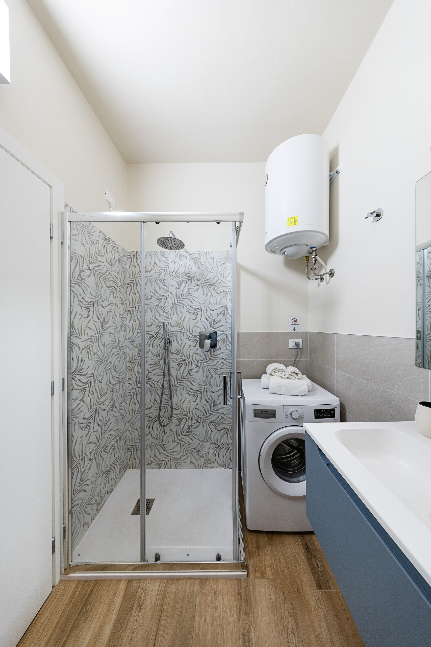 La zona notte comprende una spaziosa camera matrimoniale con armadio e un letto singolo aggiuntivo, oltre a un bagno completo con doccia, lavabo, bidet e WC. A disposizione degli ospiti anche lavatrice, asse e ferro da stiro.