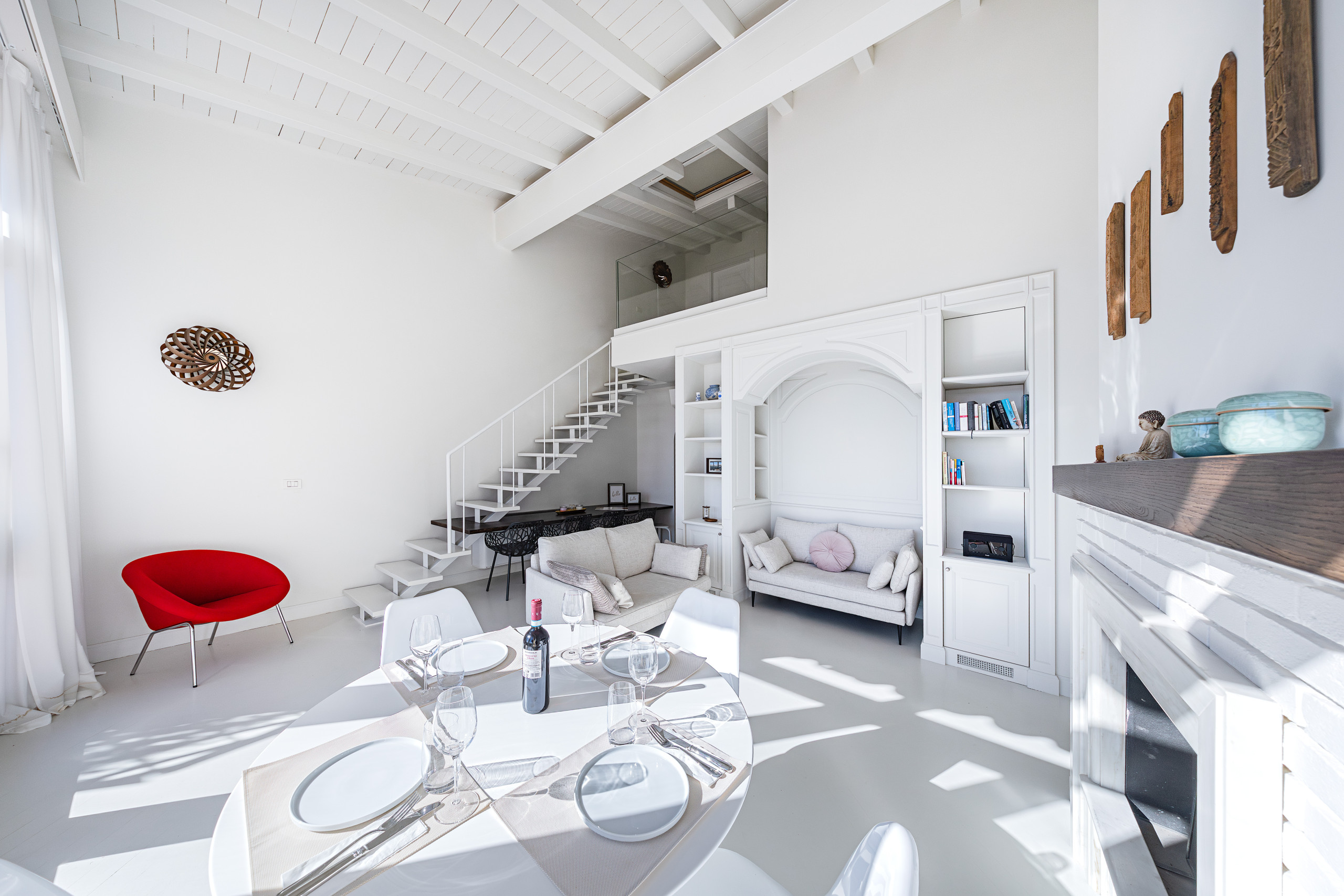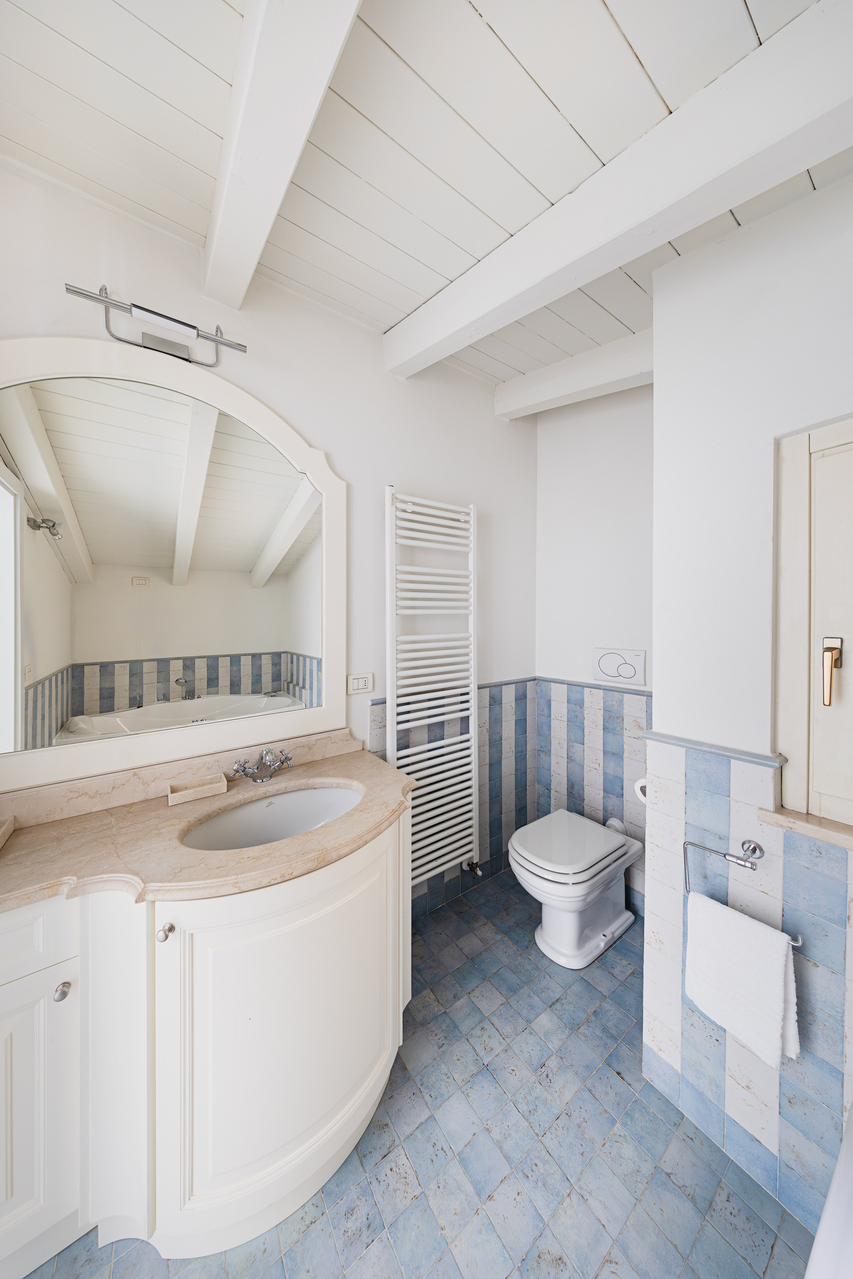 L’appartamento continua al piano superiore con la camera da letto padronale dotata di comodo letto matrimoniale ed il bagno con vasca, lavabo, bidet e WC.