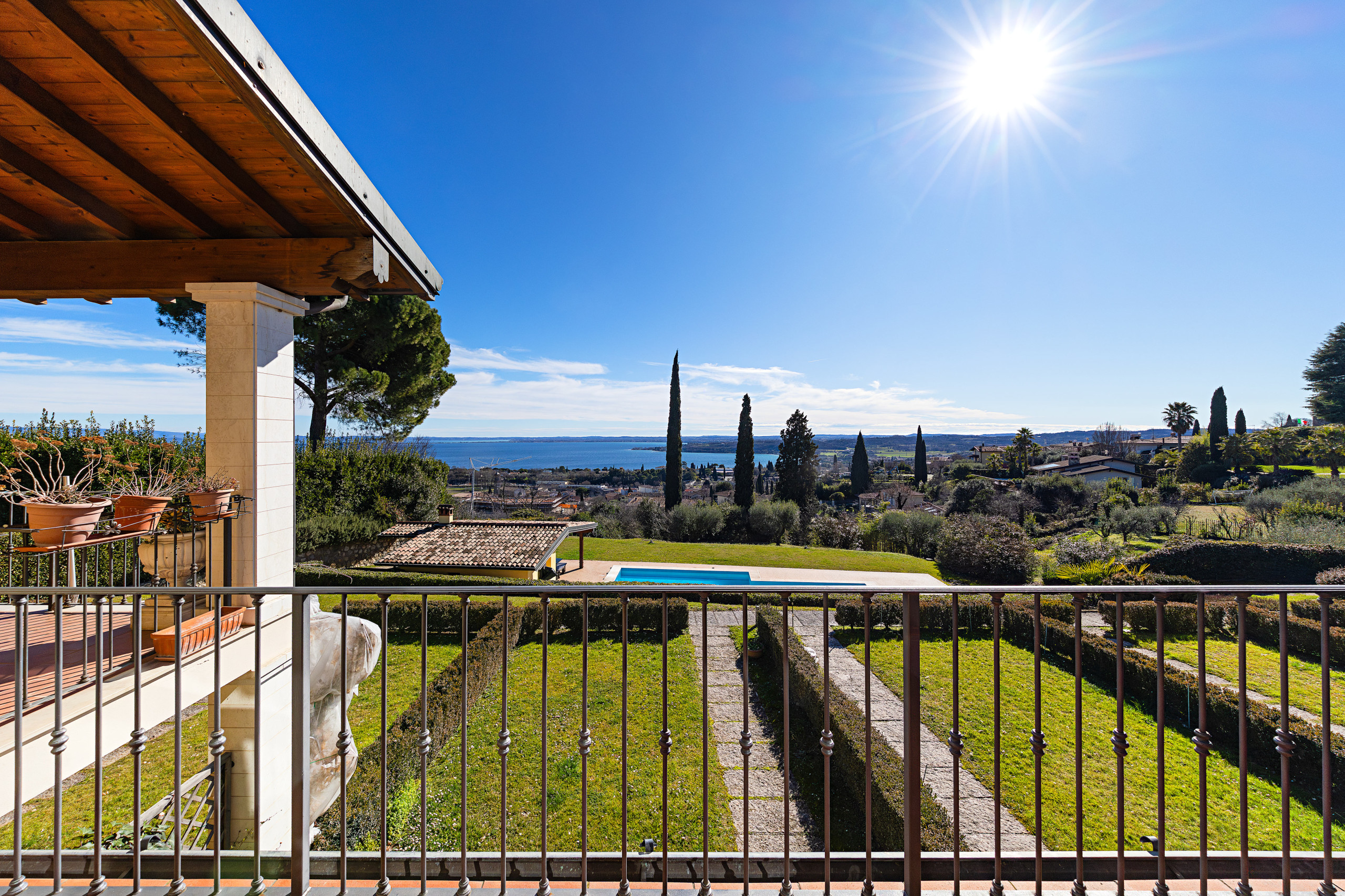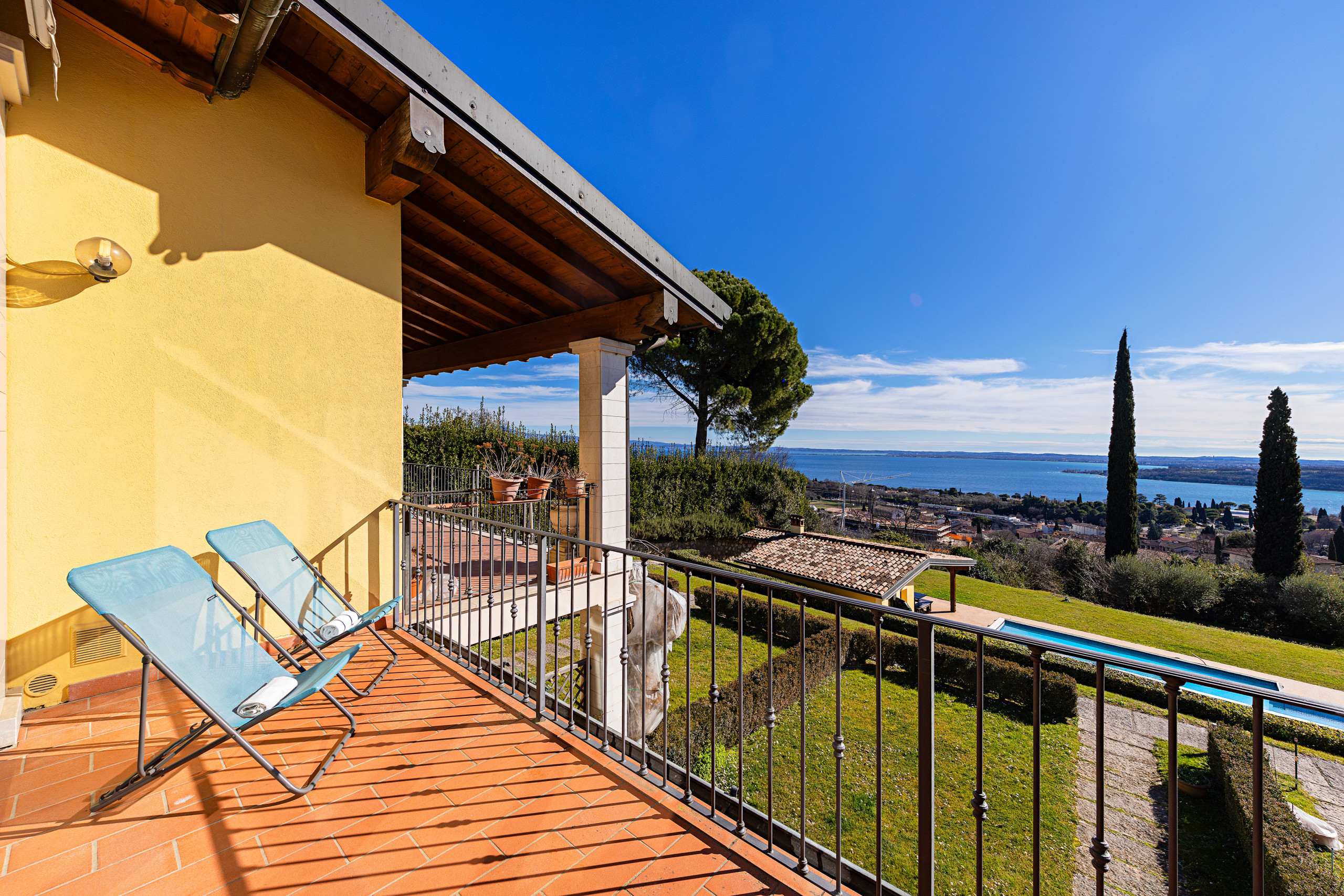 Moderno appartamento con terrazza vista lago, all'interno di un residence con piscina comune, campo da tennis e pontile con accesso diretto al lago e alla spiaggia, in un parco di 5.000 metri quadri piantumato con ulivi secolari, a Padenghe sul Garda.