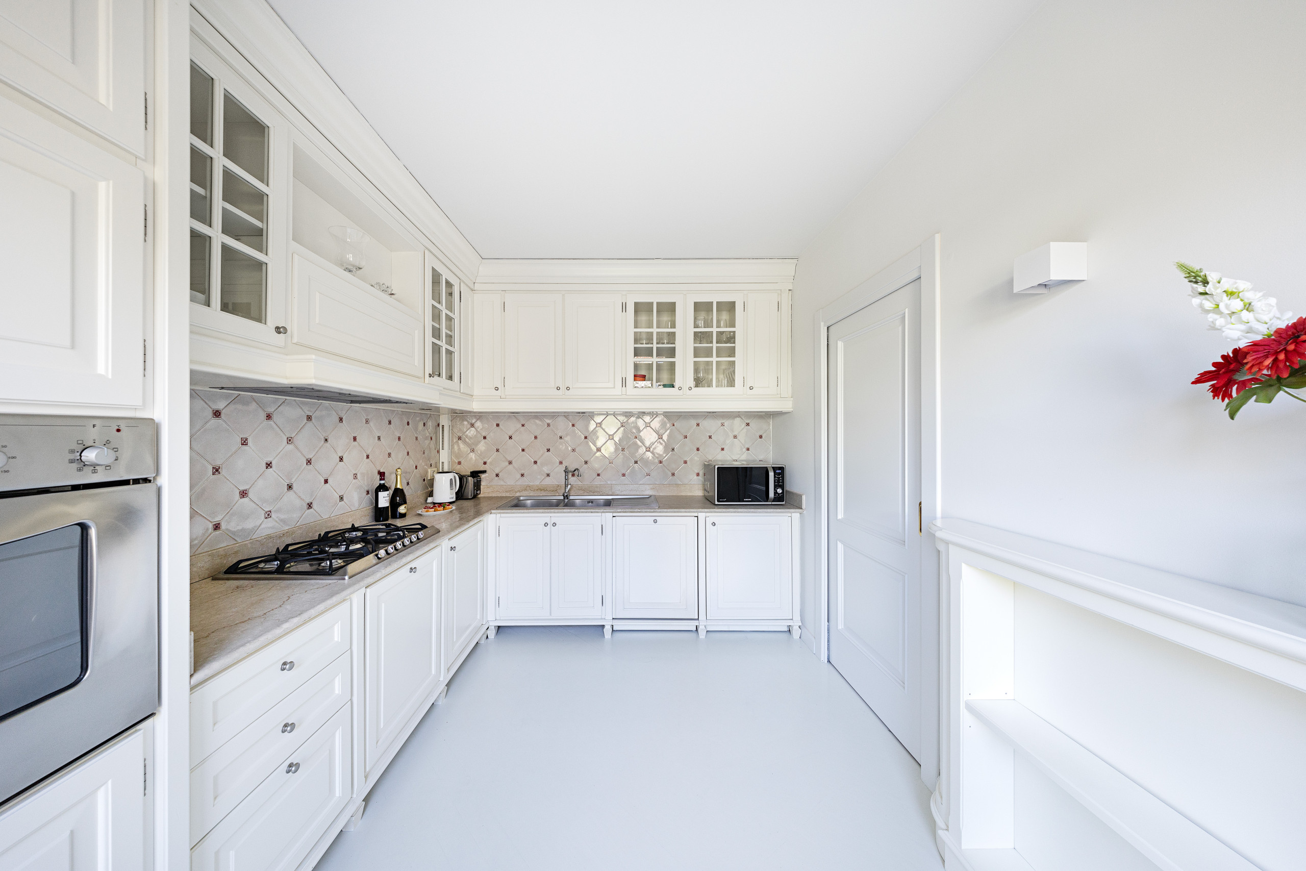 L’appartamento continua con la cucina separata dotata di piano cottura a gas, frigorifero, congelatore, forno, microonde, lavastoviglie, bollitore elettrico, spremi agrumi, macchina del caffè e tostapane, la camera da letto dotata di letto matrimoniale alla francese con misure 140x180 e armadio, il bagno con doccia, lavabo, bidet e WC.