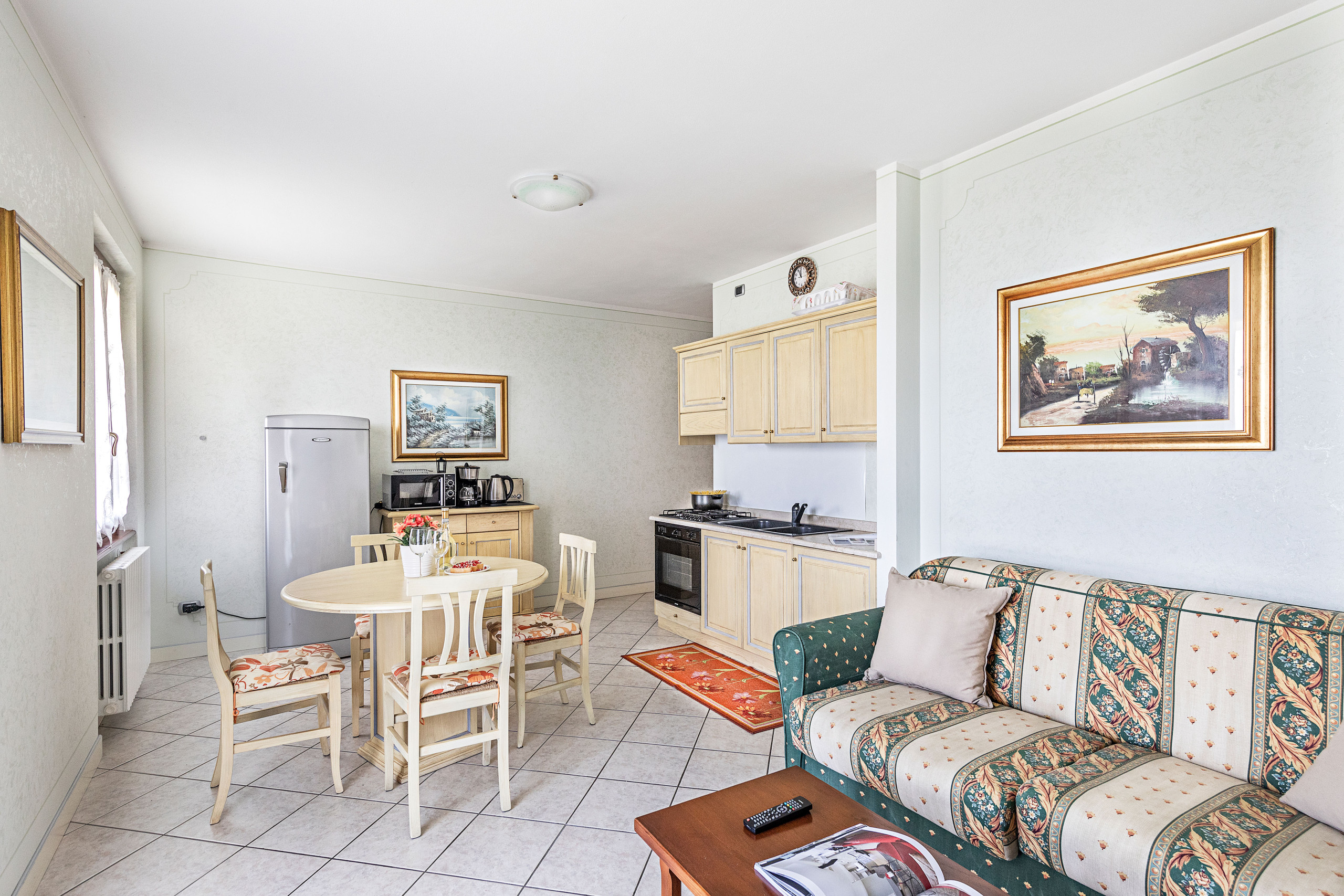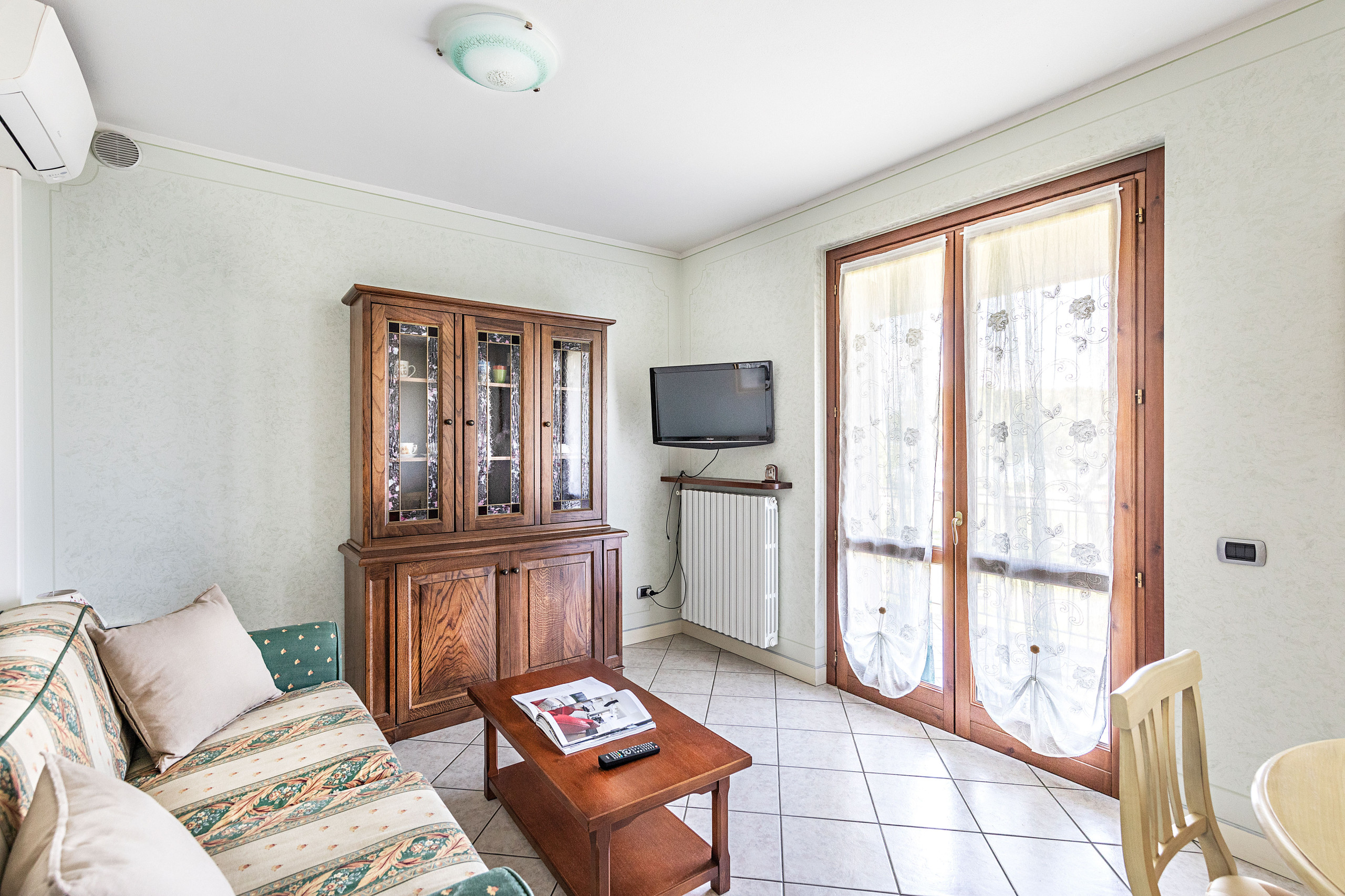 Facilmente raggiungibile tramite ascensore, l'appartamento è dotato di connessione ad internet Wi-Fi gratuita e aria condizionata in tutte le stanze. Il soggiorno da il benvenuto agli ospiti con il divano letto ad una piazza e mezza, Smart TV, tavolo da pranzo con sedie e cucina a vista completamente attrezzata di frigorifero, congelatore, macchina per caffè americano, forno, lavastoviglie, piano cottura, tostapane, bollitore, microonde e spremi agrumi; tramite porta finestra il soggiorno affaccia sulla terrazza privata e coperta che gode di bella vista sul verde e sulla piscina del residence; la terrazza è dotata di tavolo con sedie e di barbecue.