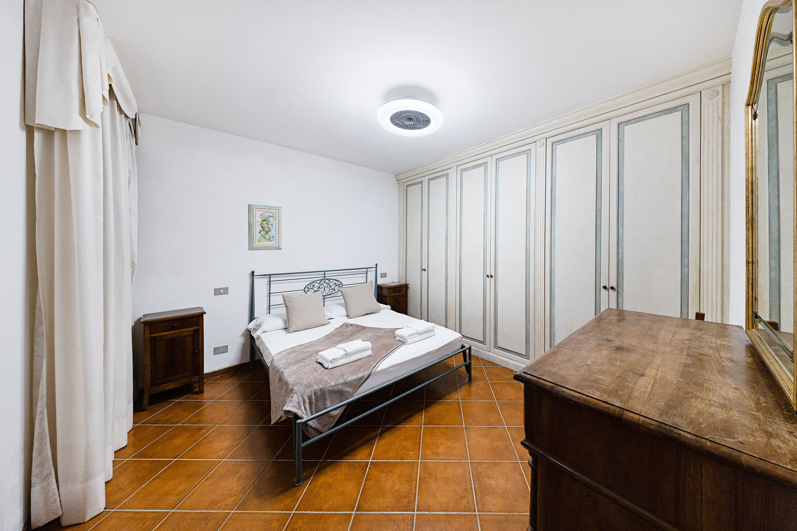 L'appartamento continua con la camera padronale dotata di letto matrimoniale e armadiature e bagno privato con doccia, lavabo, WC e bidet; il secondo bagno è dotato di vasca, lavabo, WC e bidet. La seconda camera da letto è composta da 2 letti singoli (80x180 cm) che possono anche essere uniti per formare un letto matrimoniale e armadiature. La terza camera da letto, composta da letto matrimoniale e ampie armadiature, è inoltre dotata di comoda scrivania ed affaccia sul giardino privato della casa.