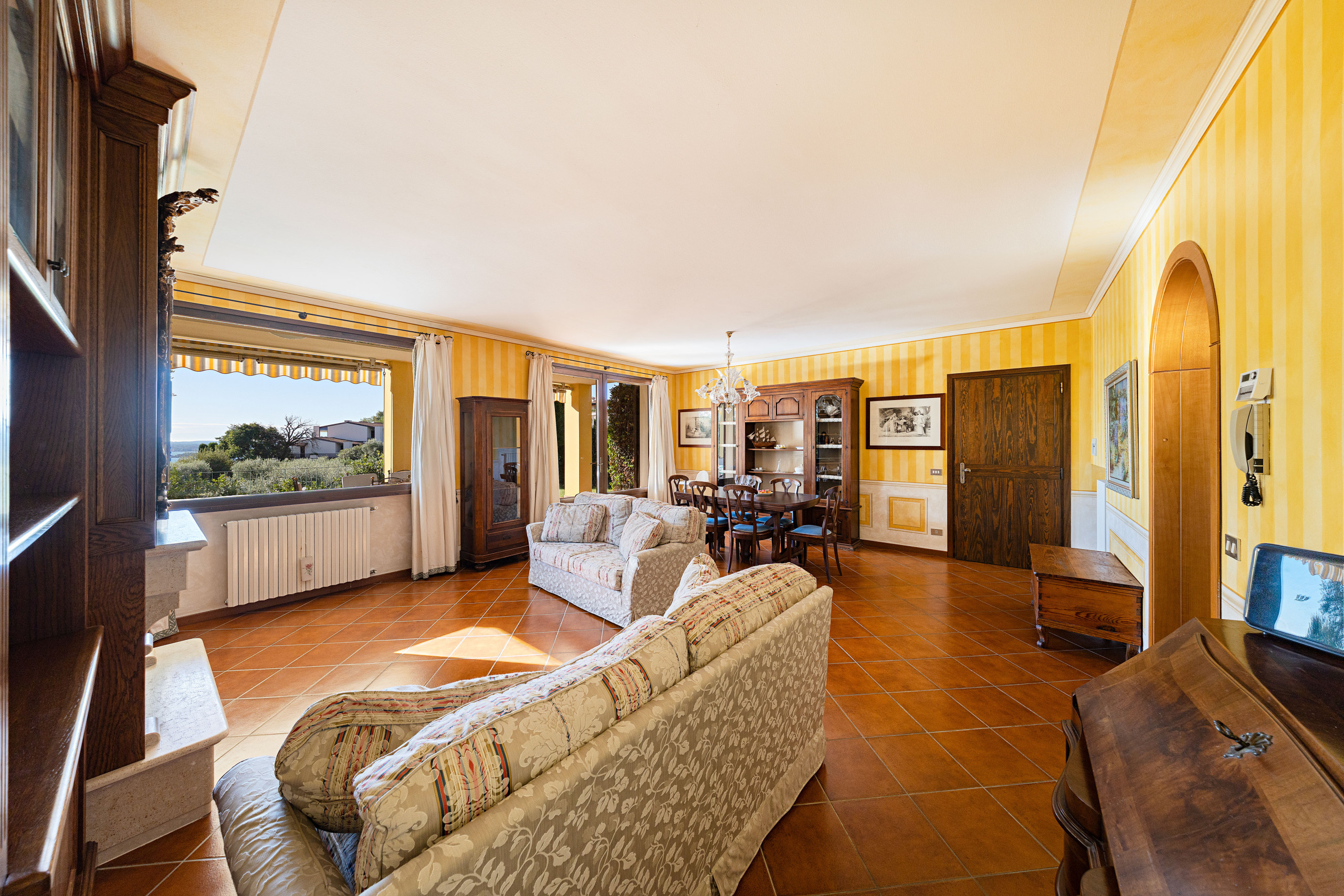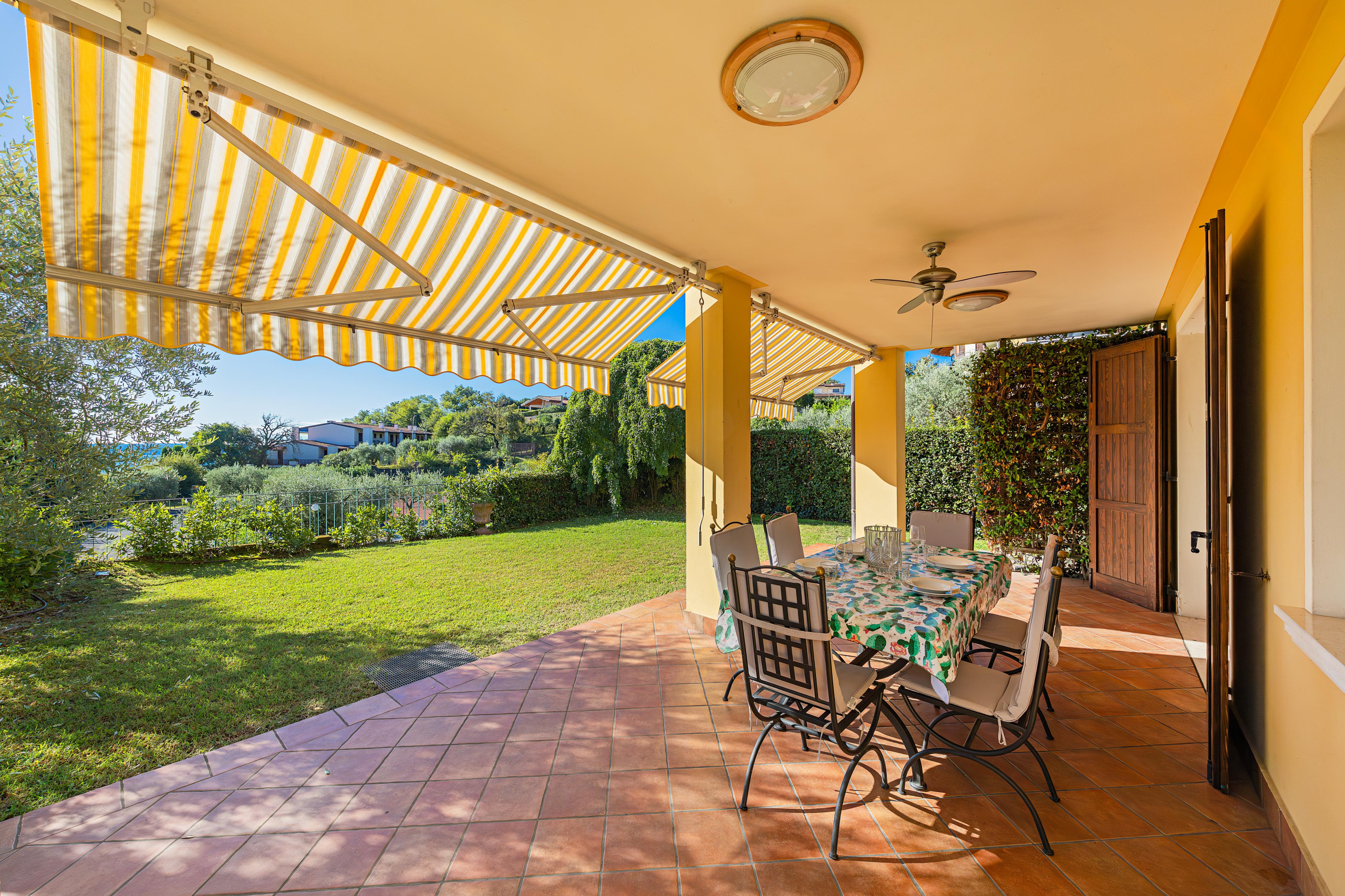 Dalle finestre del soggiorno si accede allo splendido portico coperto dotato di tavolo e sedie per colazioni e cene all'aria aperta.