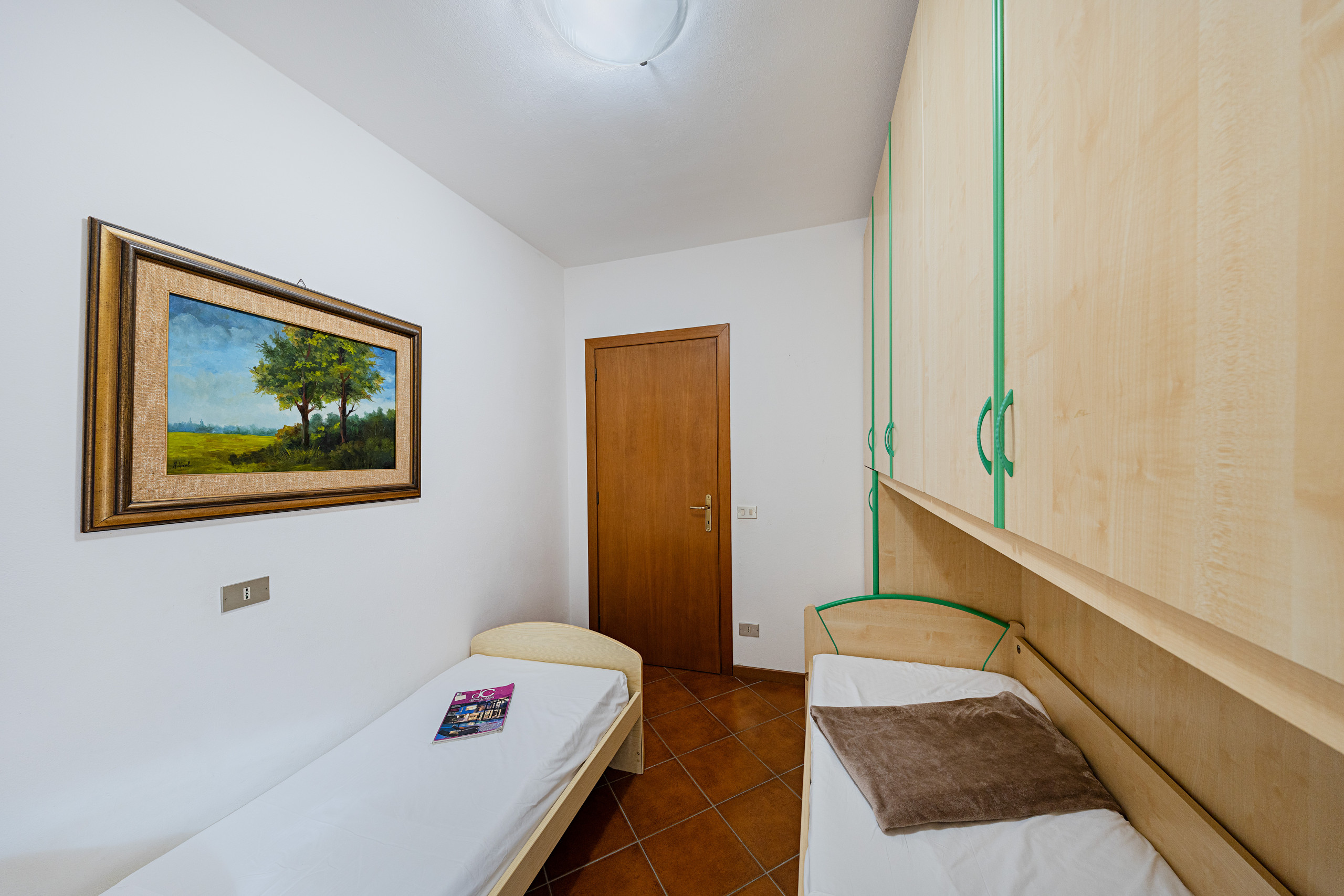 La zona notte comprende una spaziosa camera matrimoniale con armadio a vista, una seconda camera con letto a castello ed armadio, oltre a un bagno completo con doccia, lavabo, bidet e WC. A disposizione degli ospiti anche lavatrice, in una stanza dedicata in un’area del condominio, e l’ asse e ferro da stiro.