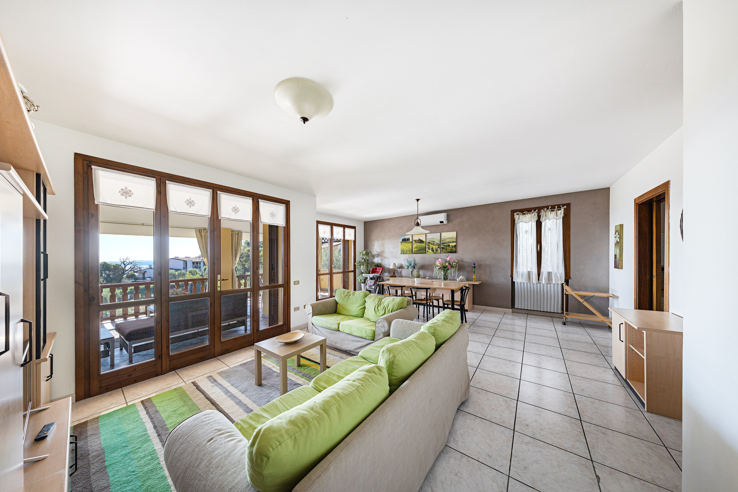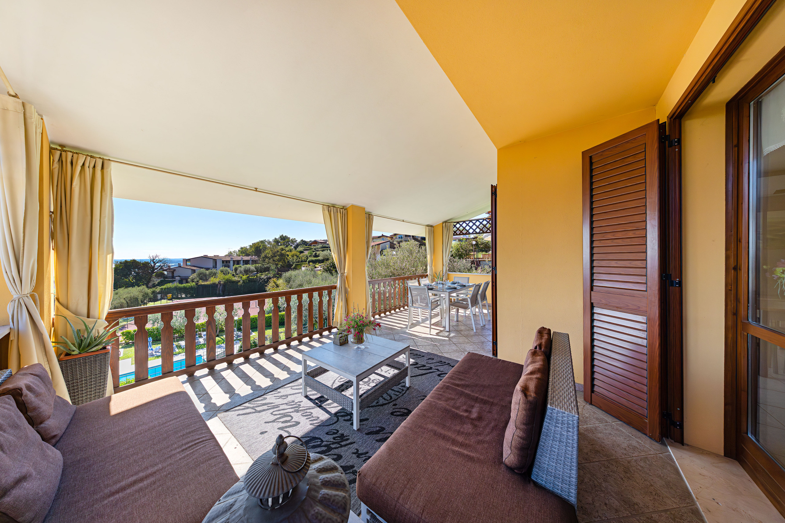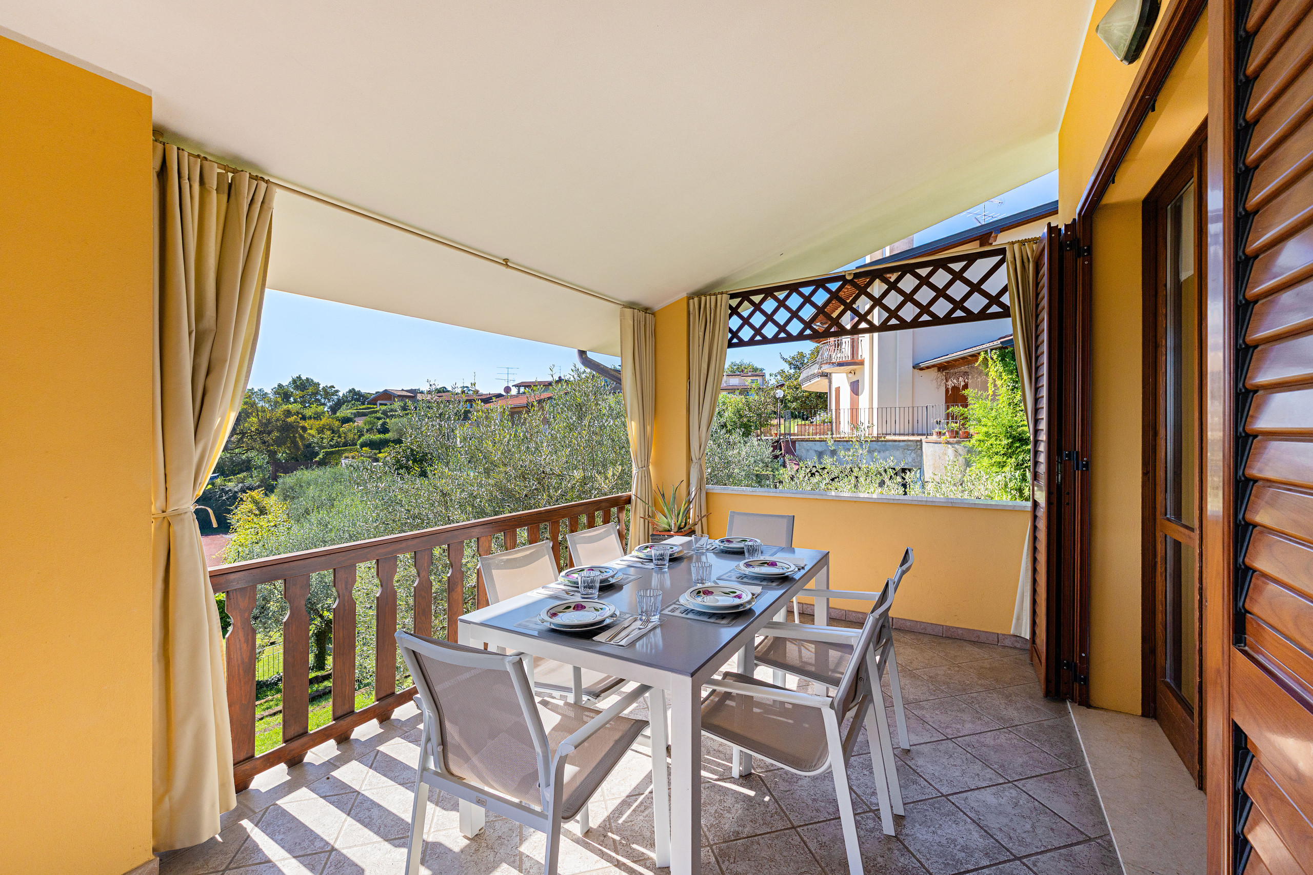Dalle finestre del soggiorno si accede allo splendido terrazzo coperto dotato di tavolo e sedie per colazioni e cene all'aria aperta e di comoda area relax con divanetti da cui ammirare il Lago di Garda.