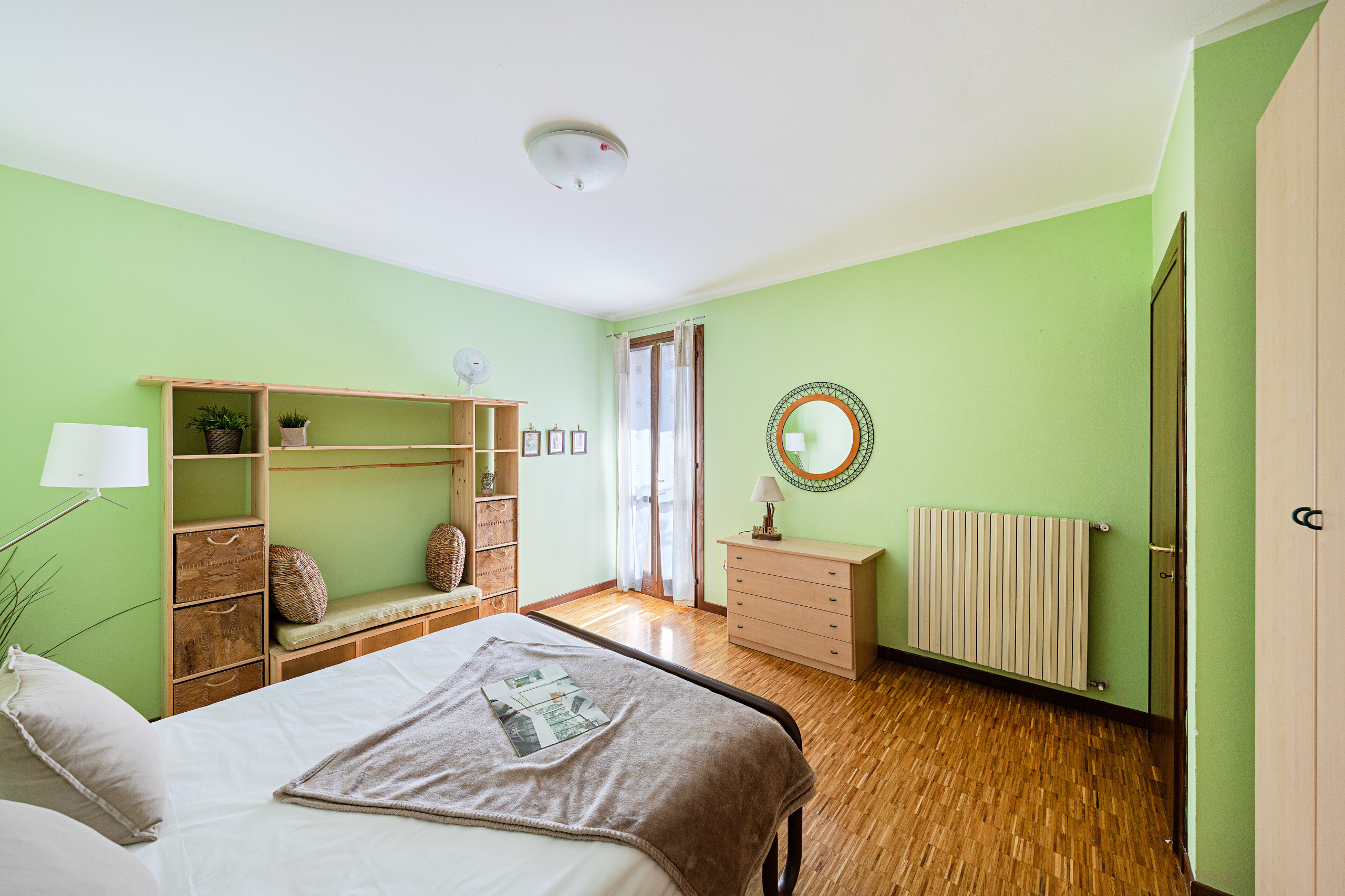 L'appartamento continua con la camera padronale dotata di letto matrimoniale e armadiature, il bagno che è dotato di doccia, lavabo, WC e bidet e la seconda camera da letto dotata di due letti a castello ciascuno di misure 89x190.