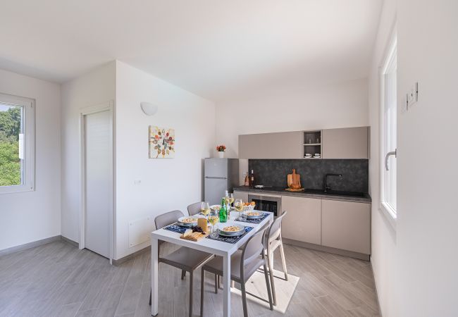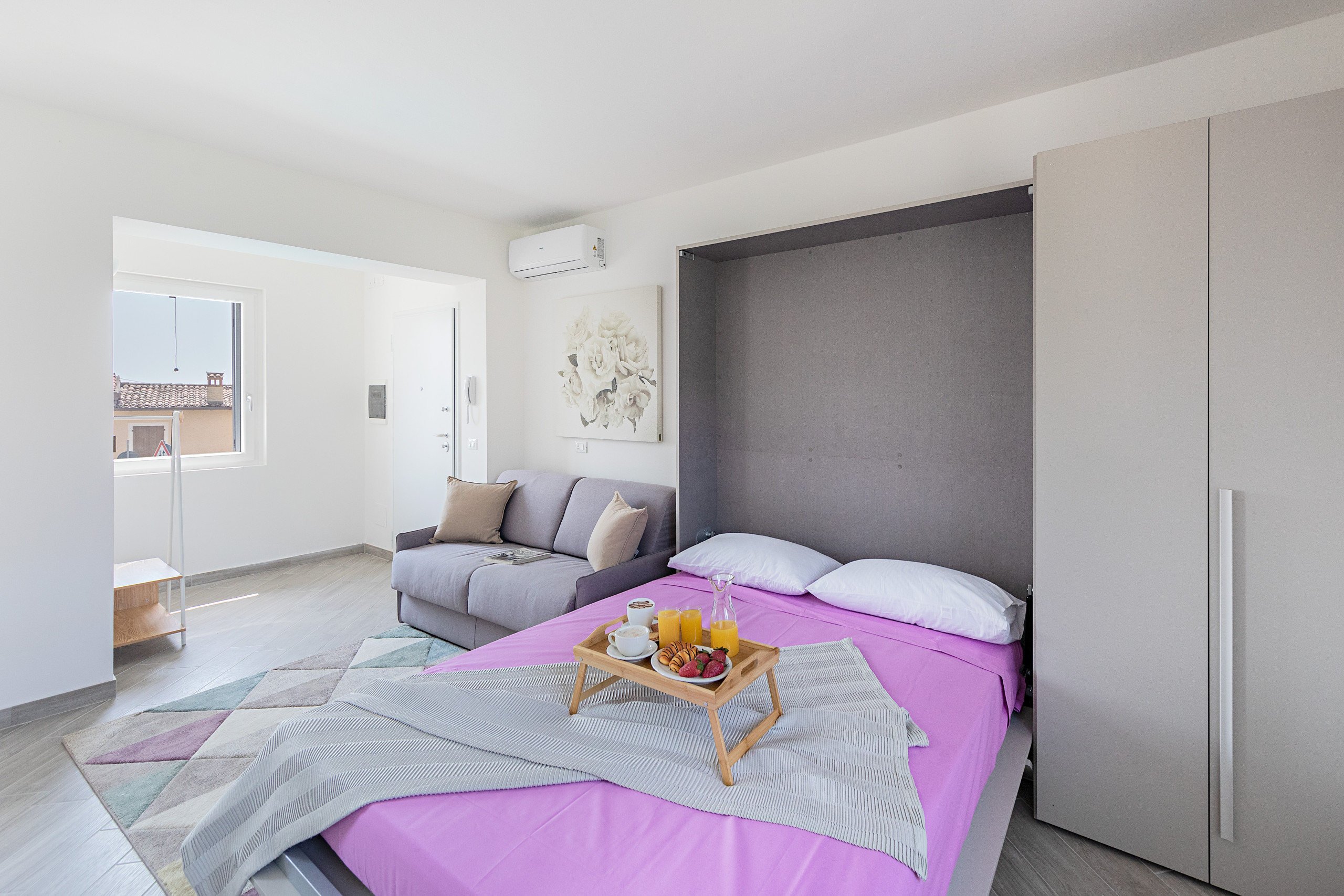 L’appartamento, dotato di connessione Wi-Fi gratuita e aria condizionata, offre un grazioso arredo moderno. Il soggiorno è arredato con un comodo divano letto matrimoniale a ribalta e con un divano letto trasformabile in ulteriore letto matrimoniale, Smart TV a schermo piatto e tavolo da pranzo con sedie.