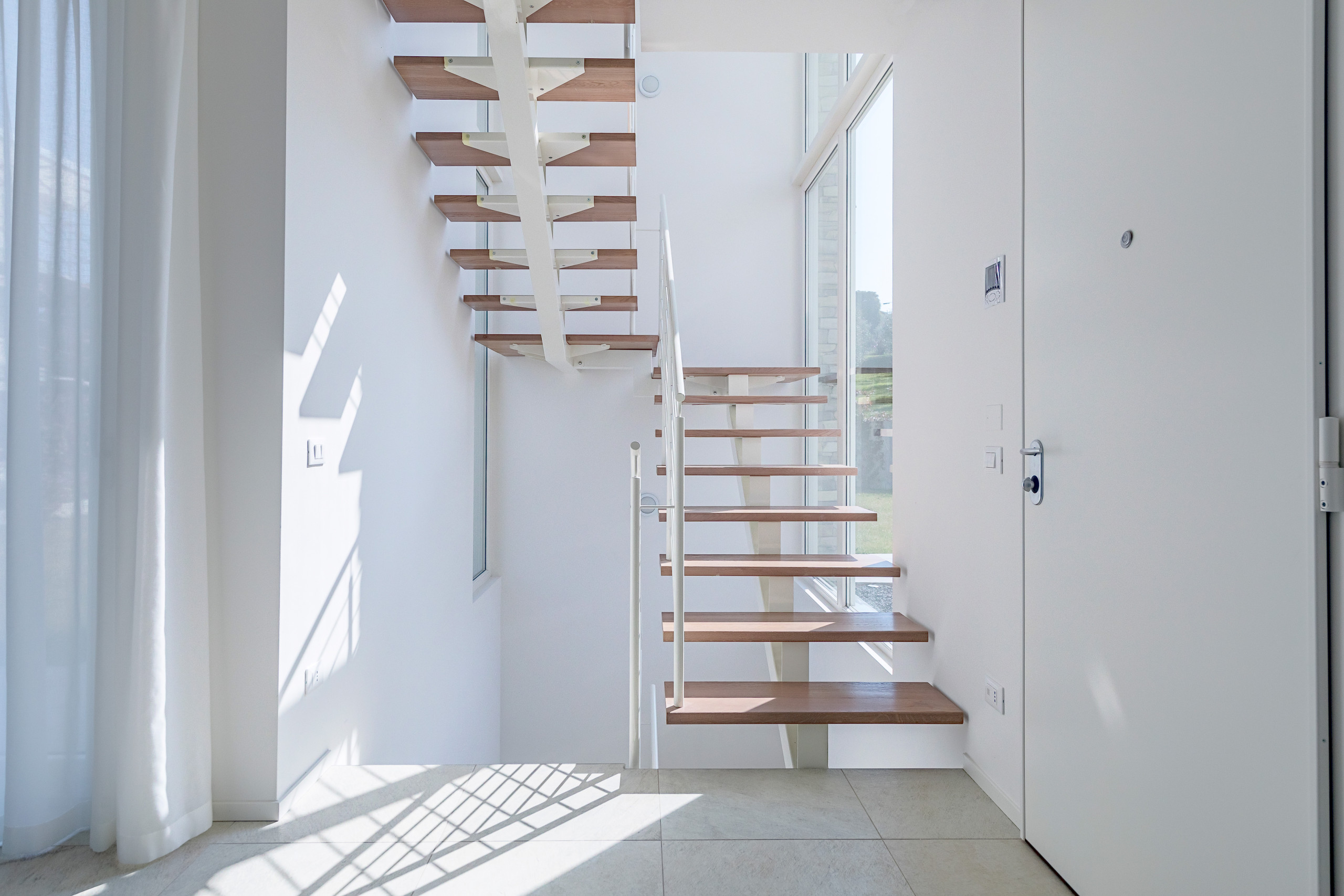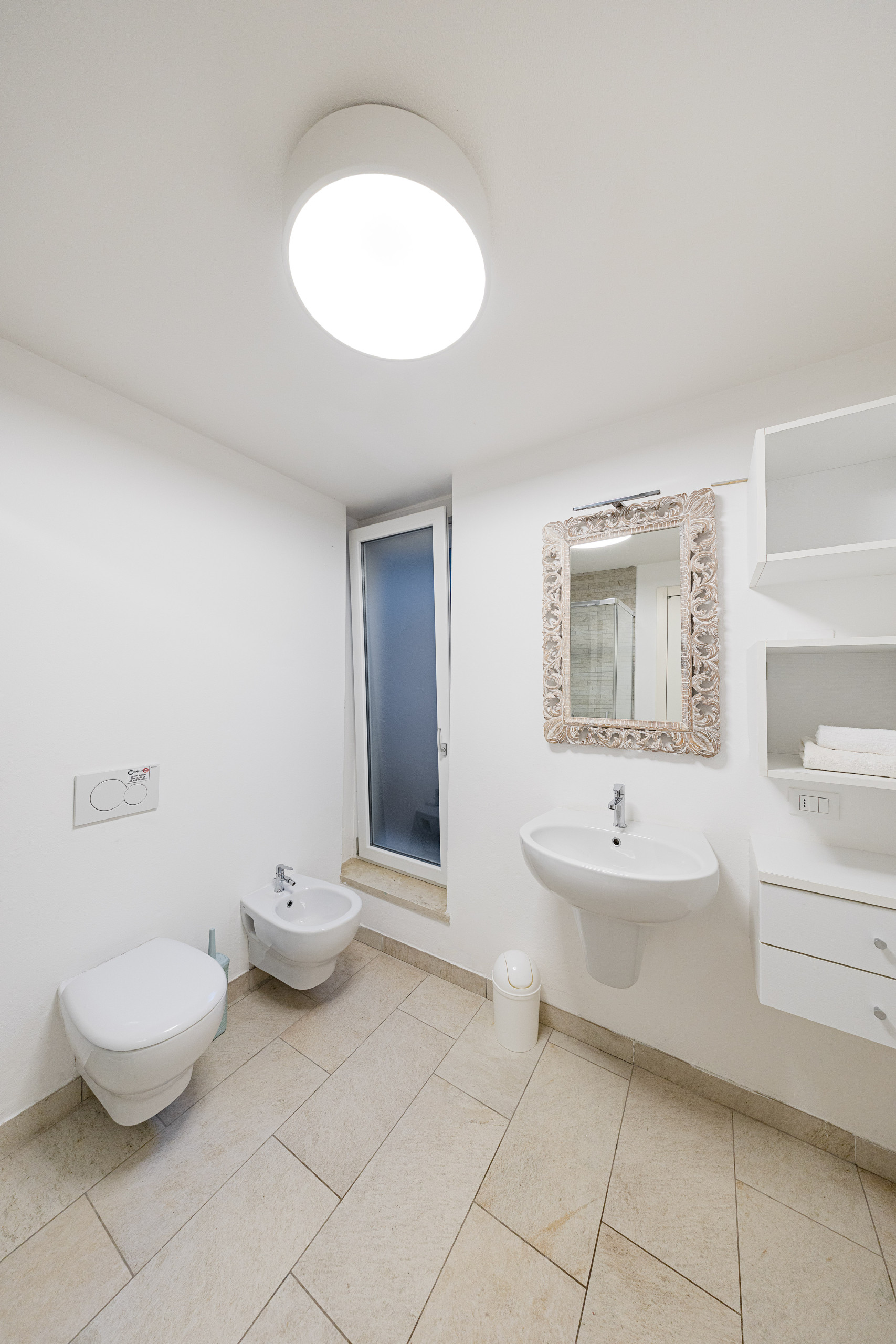Il piano inferiore continua con un ulteriore bagno dotato di doccia, lavabo, bidet, WC e una zona lavanderia con lavatrice, ferro e asse da stiro.
