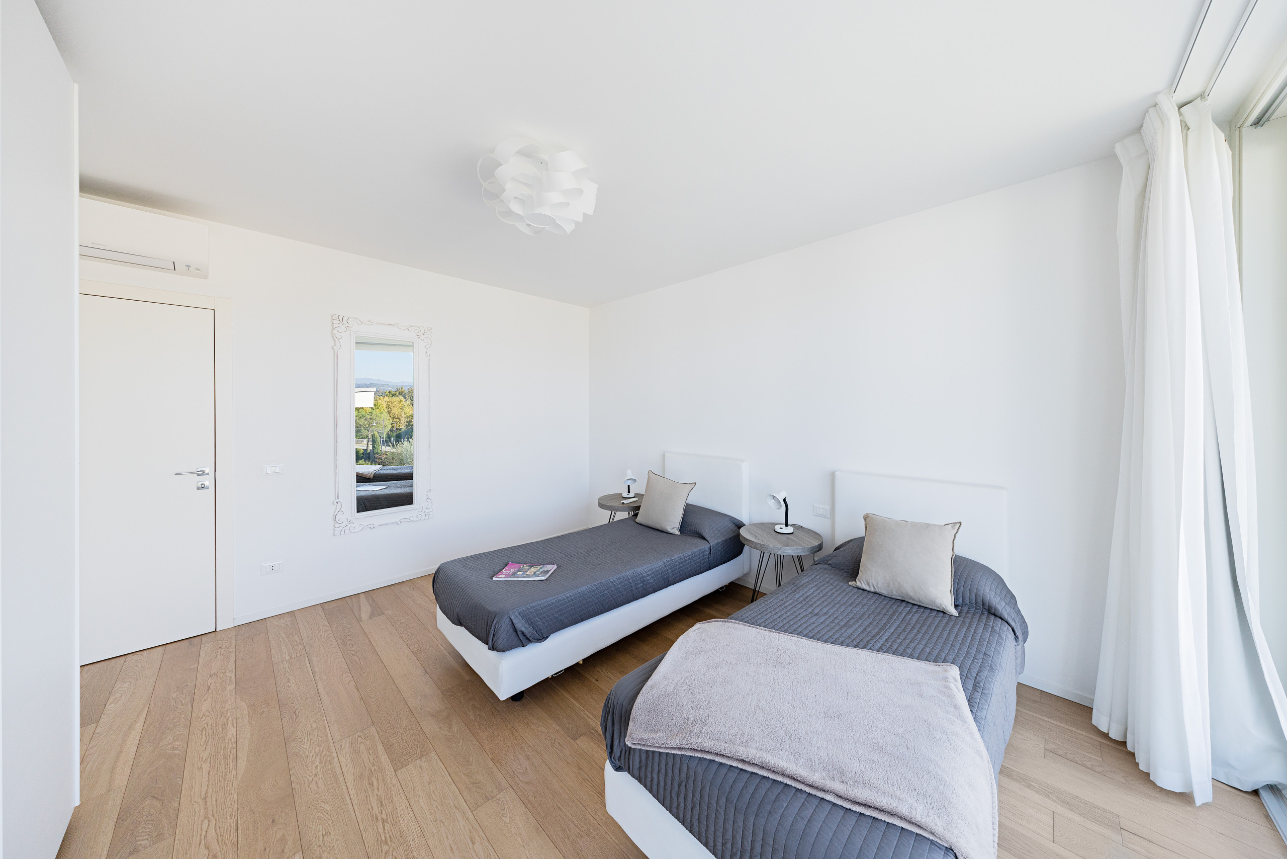 Al piano superiore della villa sono collocate le due camere da letto: la prima, ampia e padronale è dotata di letto matrimoniale, armadi e balcone da cui si gode di un bello scorcio del lago, e la seconda dotata di due letti singoli. Il piano primo viene completato dal bagno dotato di doccia, lavabo, bidet e WC. La villa è dotata di aria condizionata in tutte le camere da letto al piano primo e nel soggiorno al piano terra.