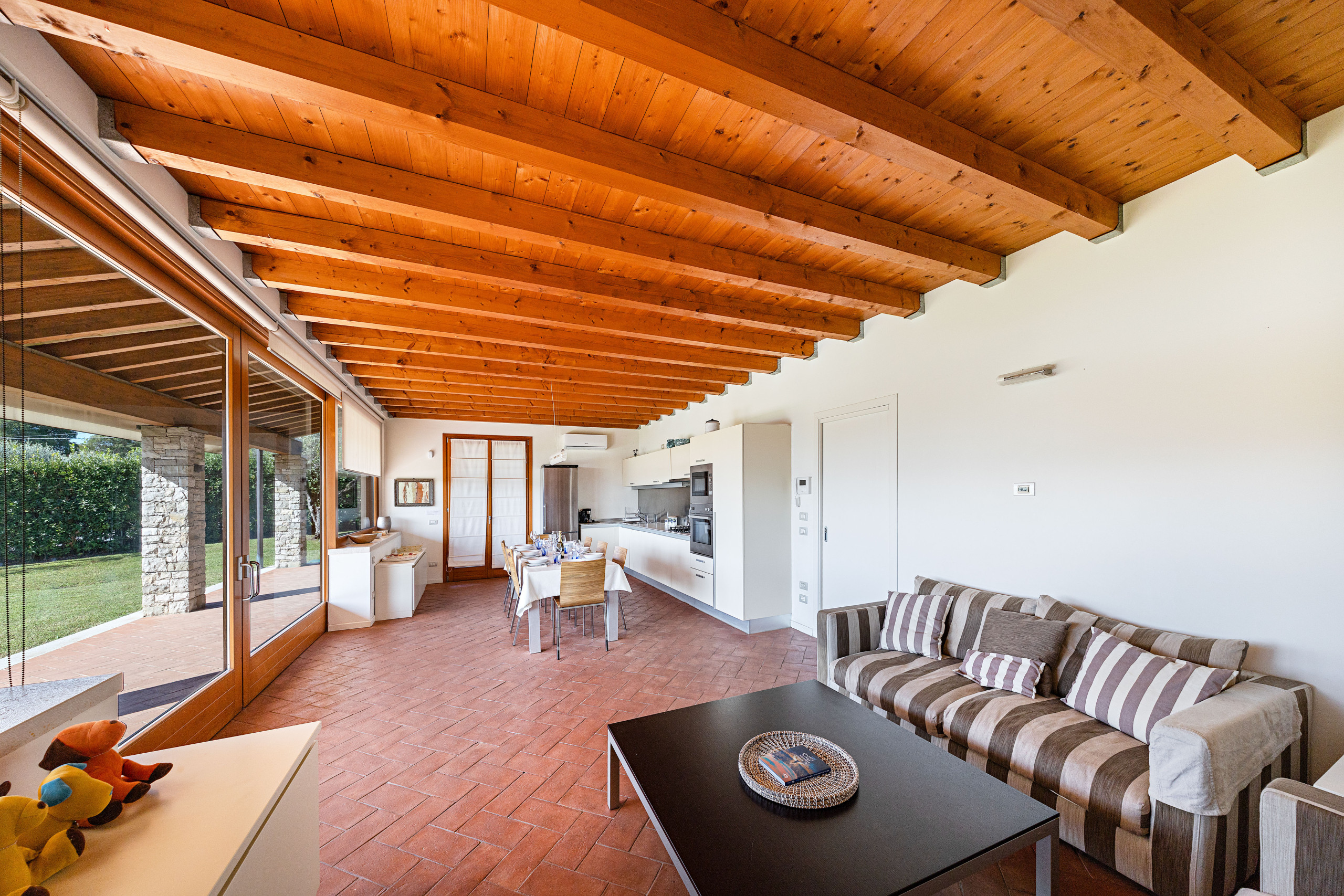 All'entrata la villa accoglie gli ospiti con l'ampio soggiorno arredato con travi a vista, due divani, Smart TV, tavolo da pranzo con sedie e cucina a vista dotata di piano cottura a gas, frigorifero, congelatore, forno, macchina del caffè americano, microonde, lavastoviglie, bollitore elettrico e tostapane. Tramite una porta finestra si accede al portico coperto, finemente arredato con tavolo e sedie da esterno dove è inoltre presente la zona barbecue, e all’ampio giardino con piscina.