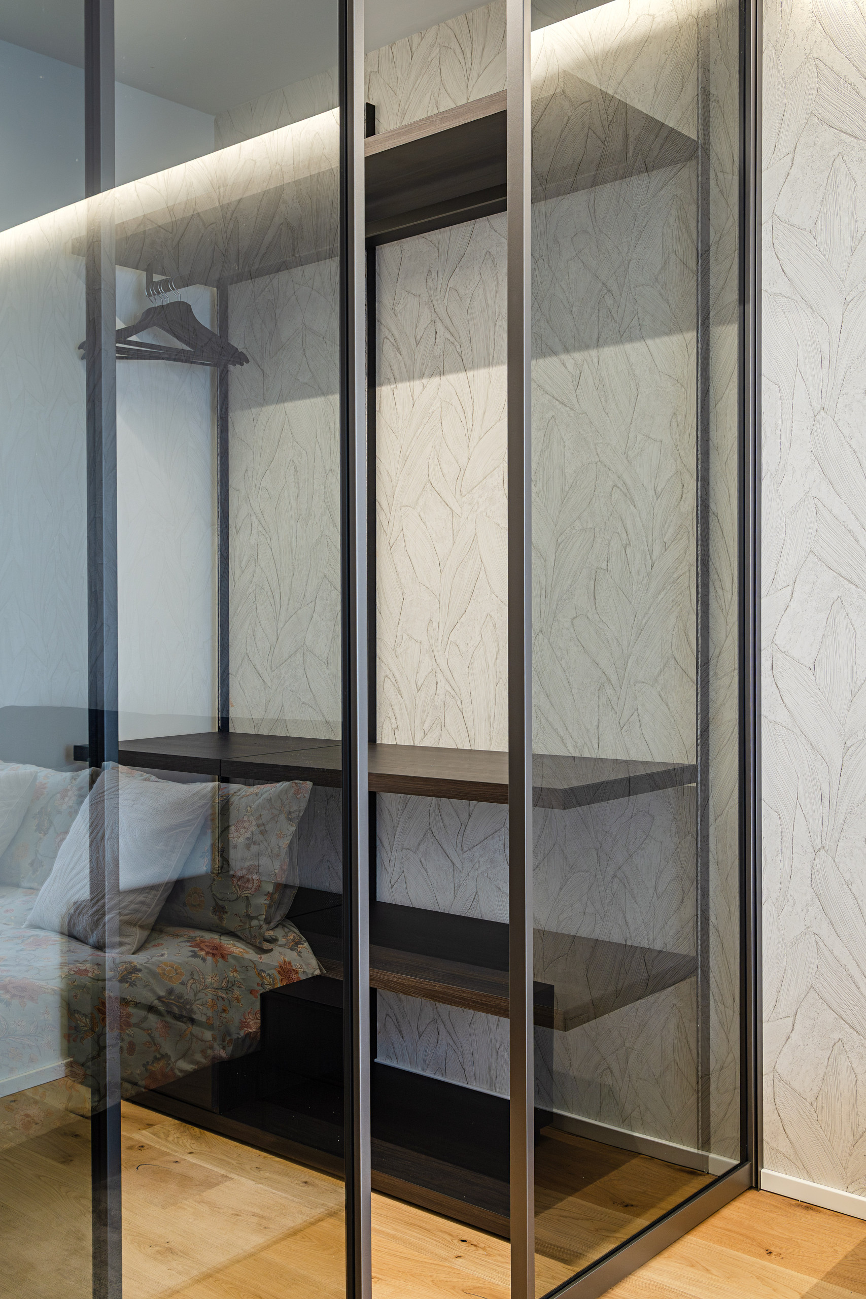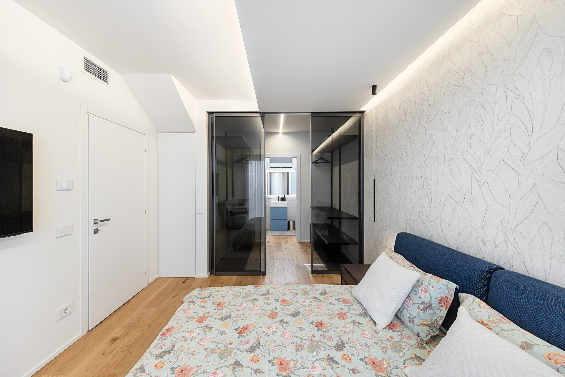 Al piano primo è collocata la suite padronale dotata di letto matrimoniale, Smart TV, cabina armadio a vetro, bagno privato ensuite dotato di doccia, lavabo, bidet e WC. Questa camera da letto affaccia sulla terrazza privata del piano primo.