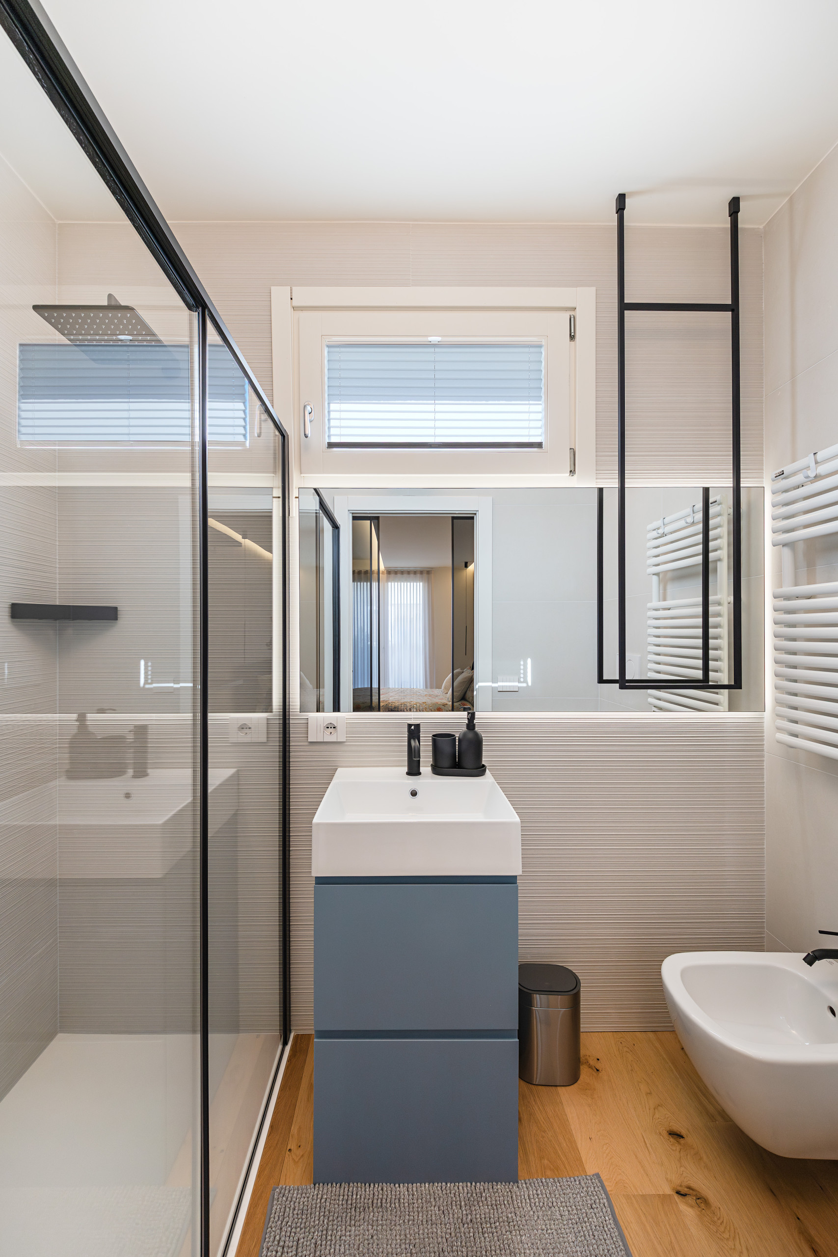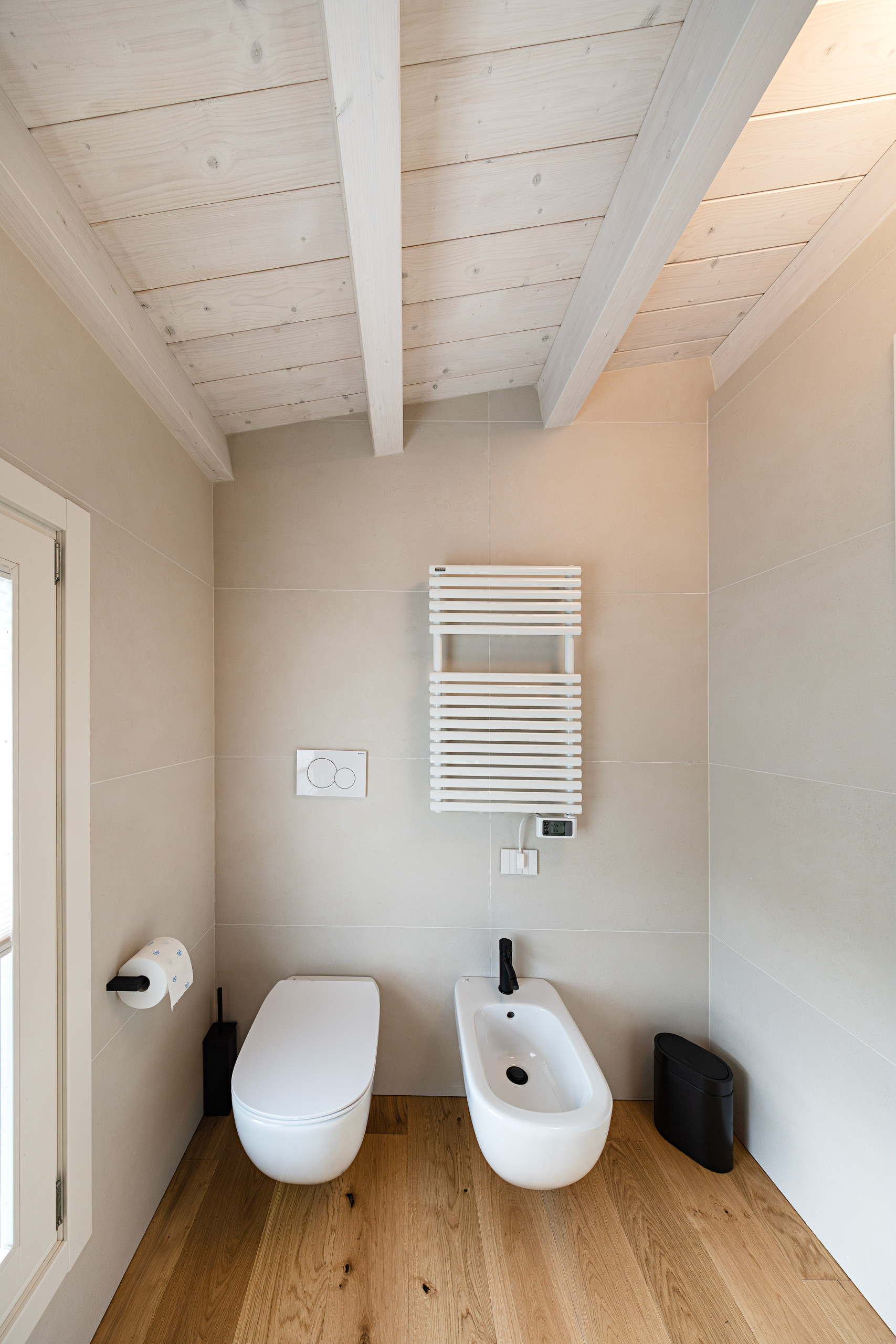 Il piano terra viene completato dal secondo bagno dotato di doccia, lavabo, bidet e WC.