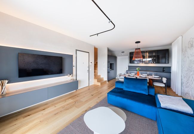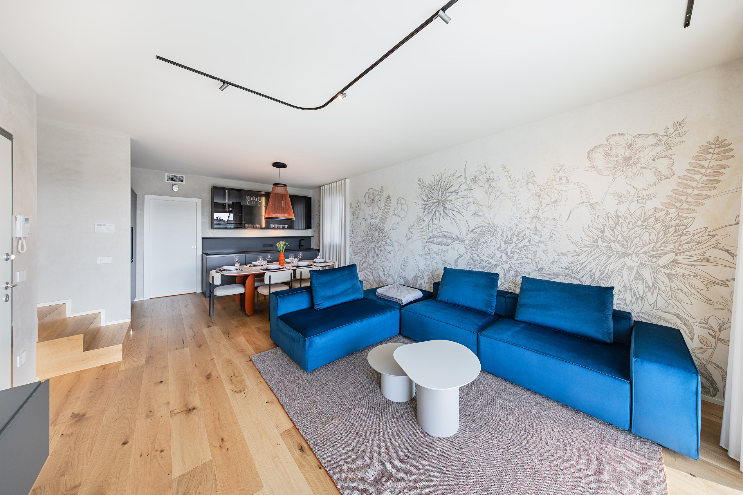 Questa affascinante proprietà accoglie gli ospiti in un ampio e luminoso soggiorno, arredato con un comodo divano letto matrimoniale, tavolo da pranzo con sedie, Smart TV e una moderna cucina a vista completamente accessoriata, dotata di forno, microonde, lavastoviglie, bollitore elettrico, spremiagrumi, tostapane e macchina per il caffè americano.