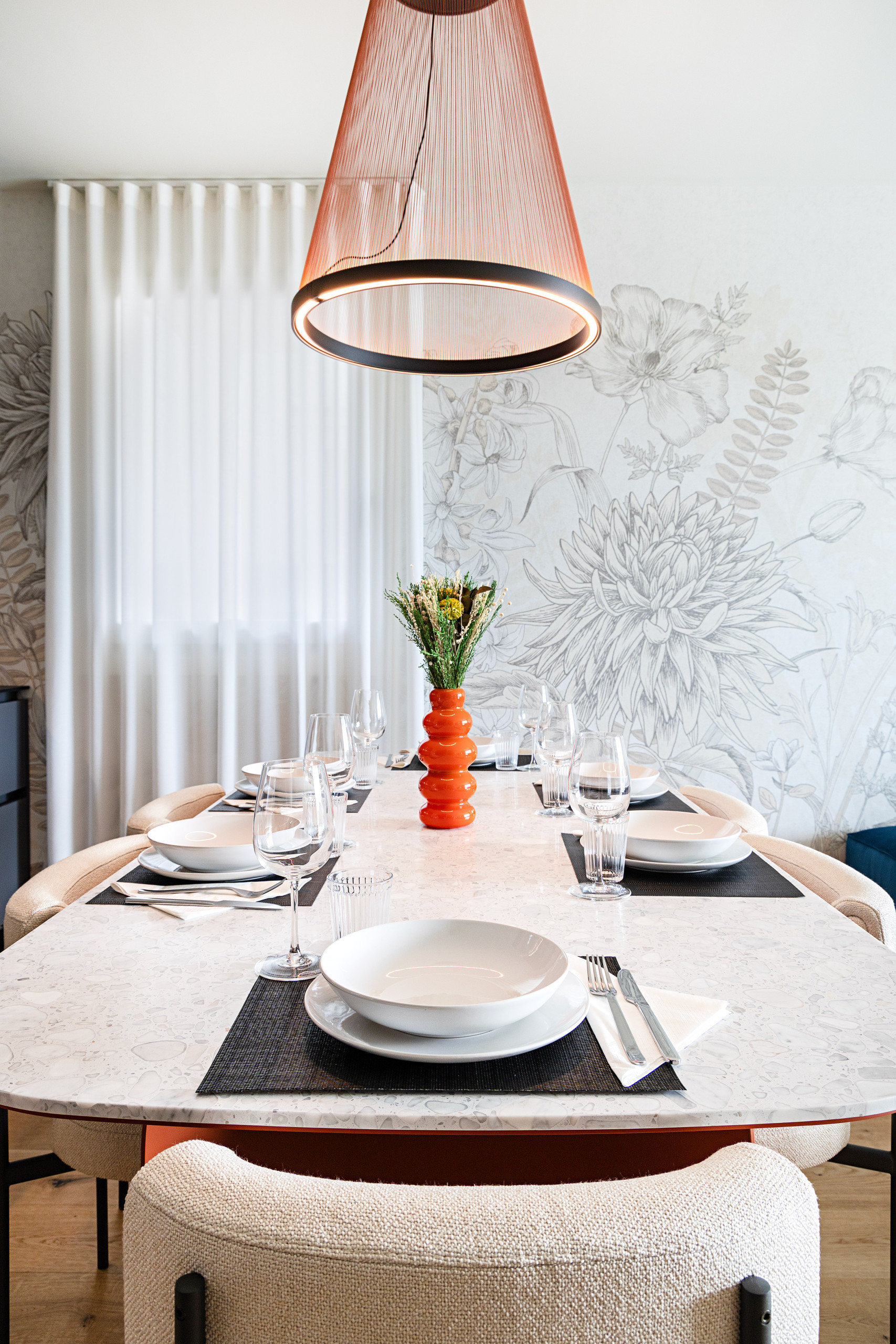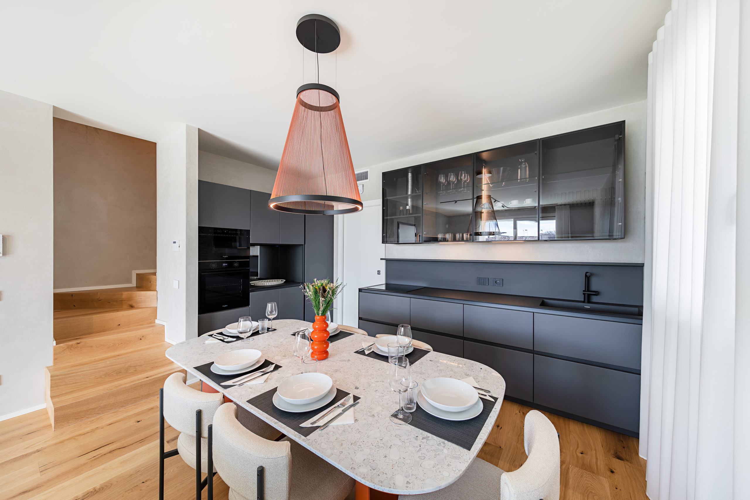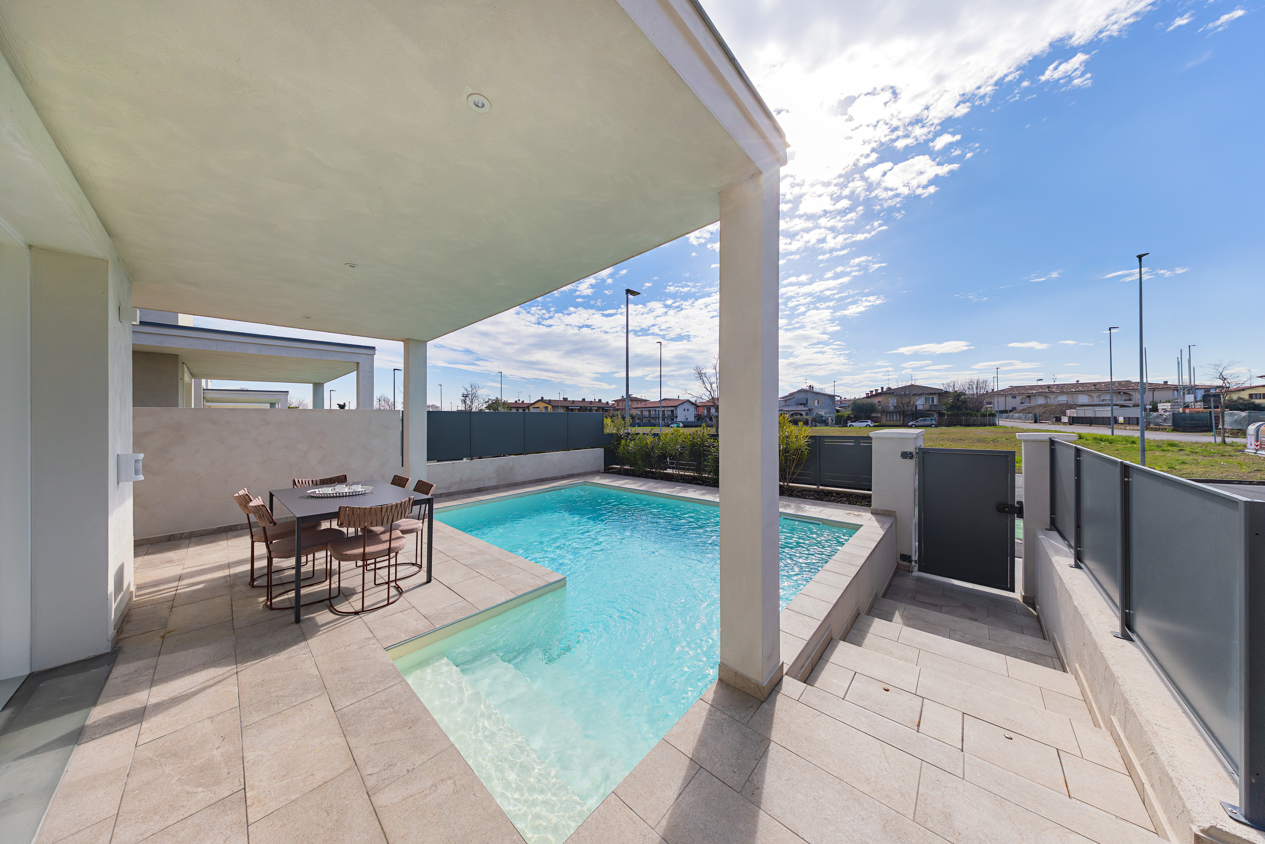 Una grande porta finestra conduce al portico privato, arredato con tavolo e sedie da esterno, ideale per pranzi all’aperto con vista sulla piscina ad uso esclusivo.