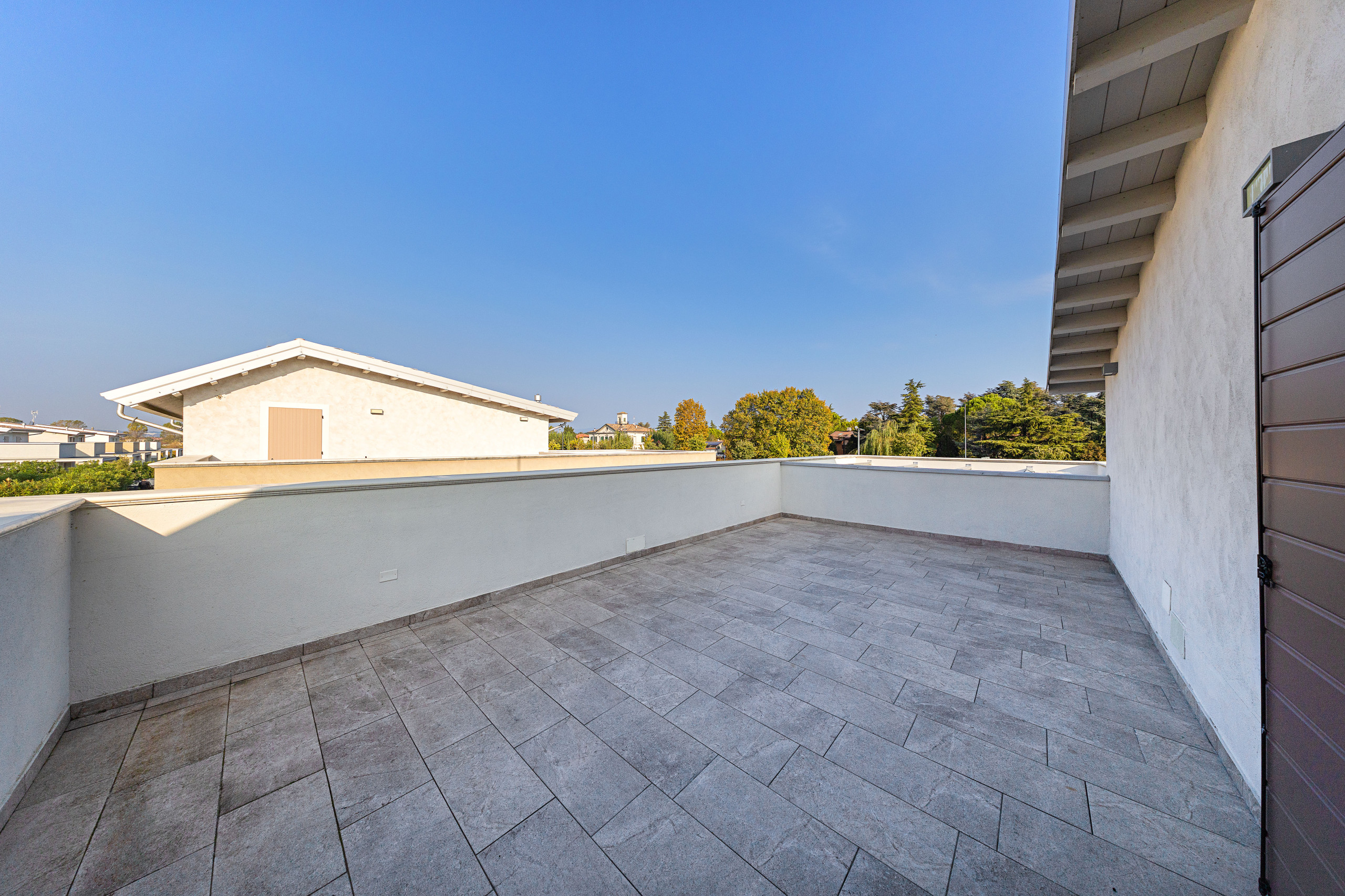 Una grande porta finestra conduce al portico privato, arredato con tavolo e sedie da esterno, ideale per pranzi all’aperto con vista sulla piscina ad uso esclusivo.