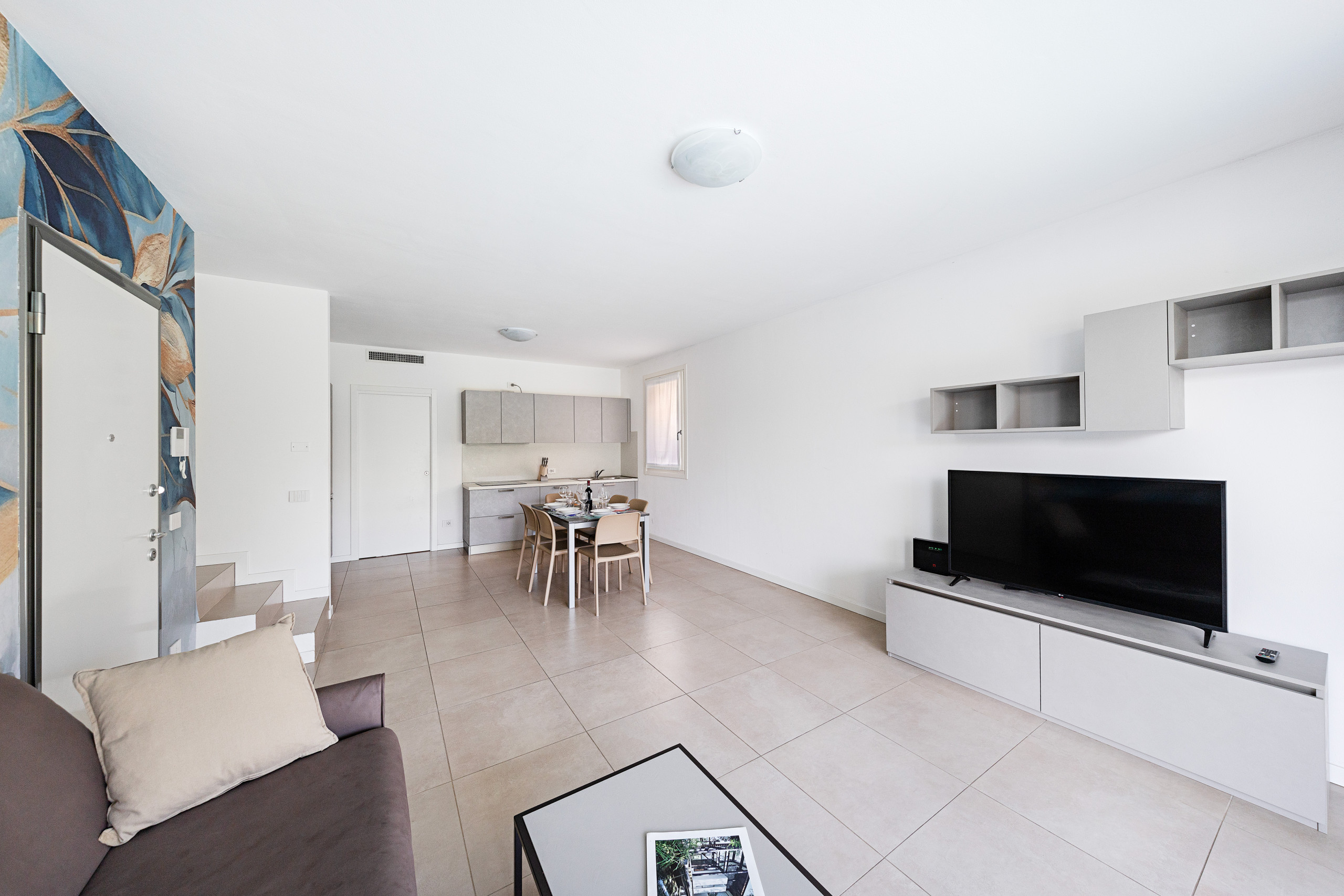 Questa affascinante proprietà accoglie gli ospiti in un ampio e luminoso soggiorno, arredato con un comodo divano letto matrimoniale, tavolo da pranzo con sedie, Smart TV e una moderna cucina a vista completamente accessoriata, dotata di forno, microonde, lavastoviglie, bollitore elettrico, spremiagrumi, tostapane e macchina per il caffè americano.
