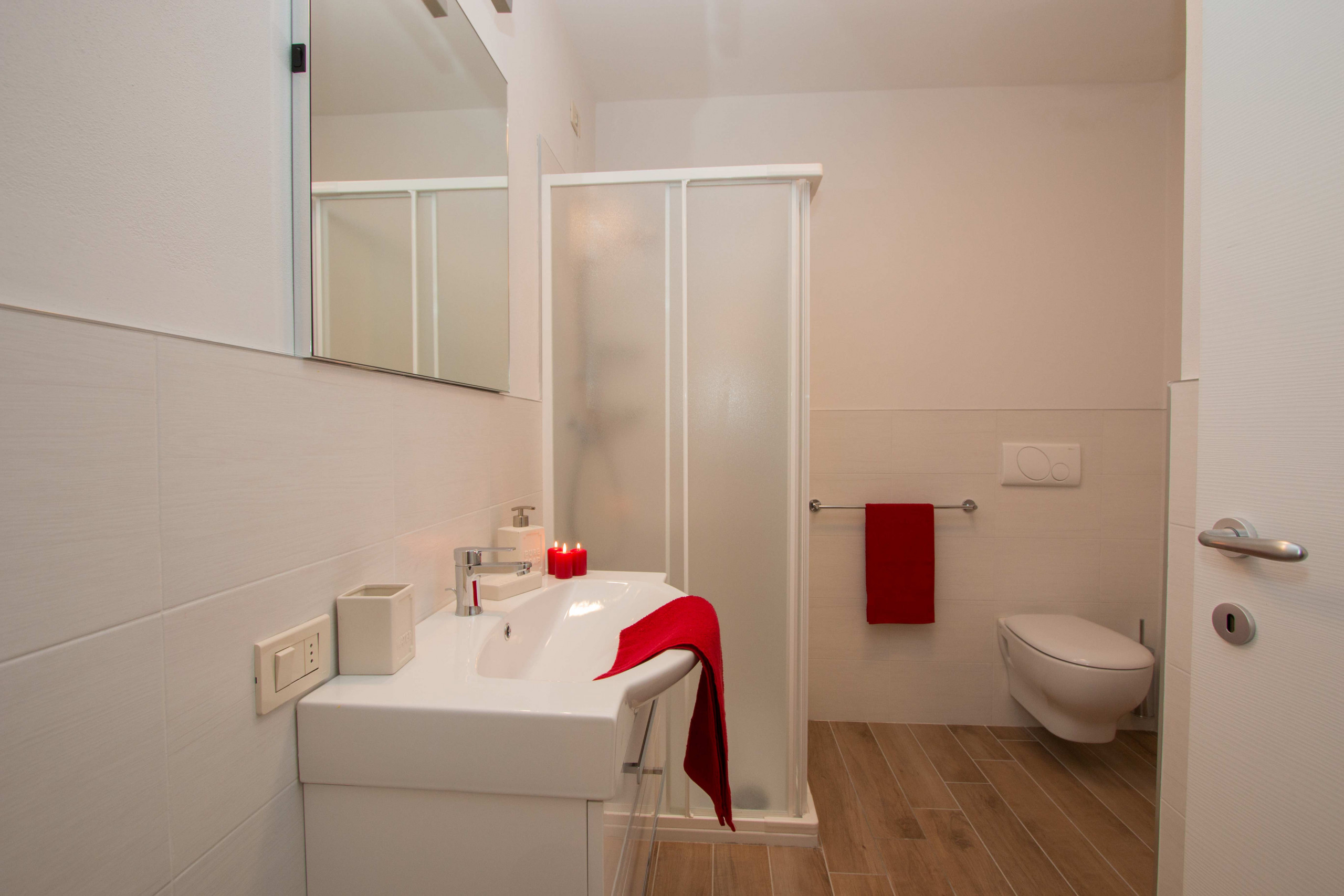 Im Erdgeschoss befindet sich zudem ein Schlafzimmer mit Klimaanlage, Doppelbett, Nachttischen, Kleiderschränken und Smart-TV mit internationalen Sendern – ebenfalls mit wunderschönem Blick auf den See – sowie ein Badezimmer mit Waschbecken, Dusche, Bidet und WC.