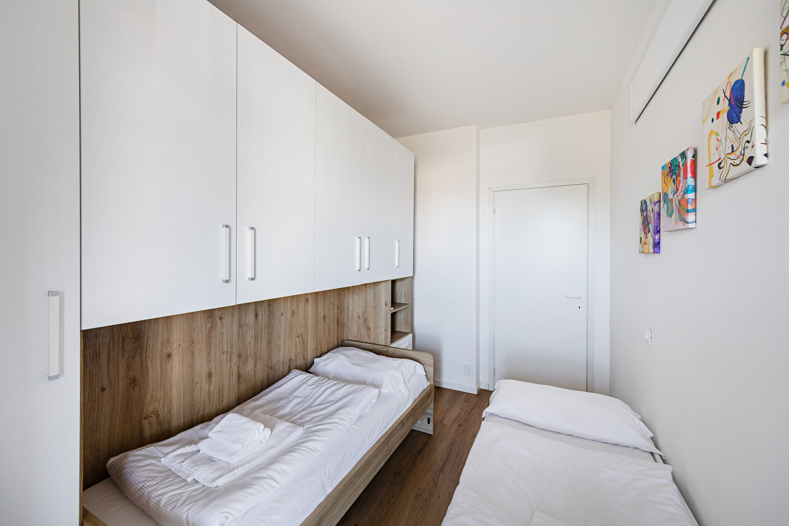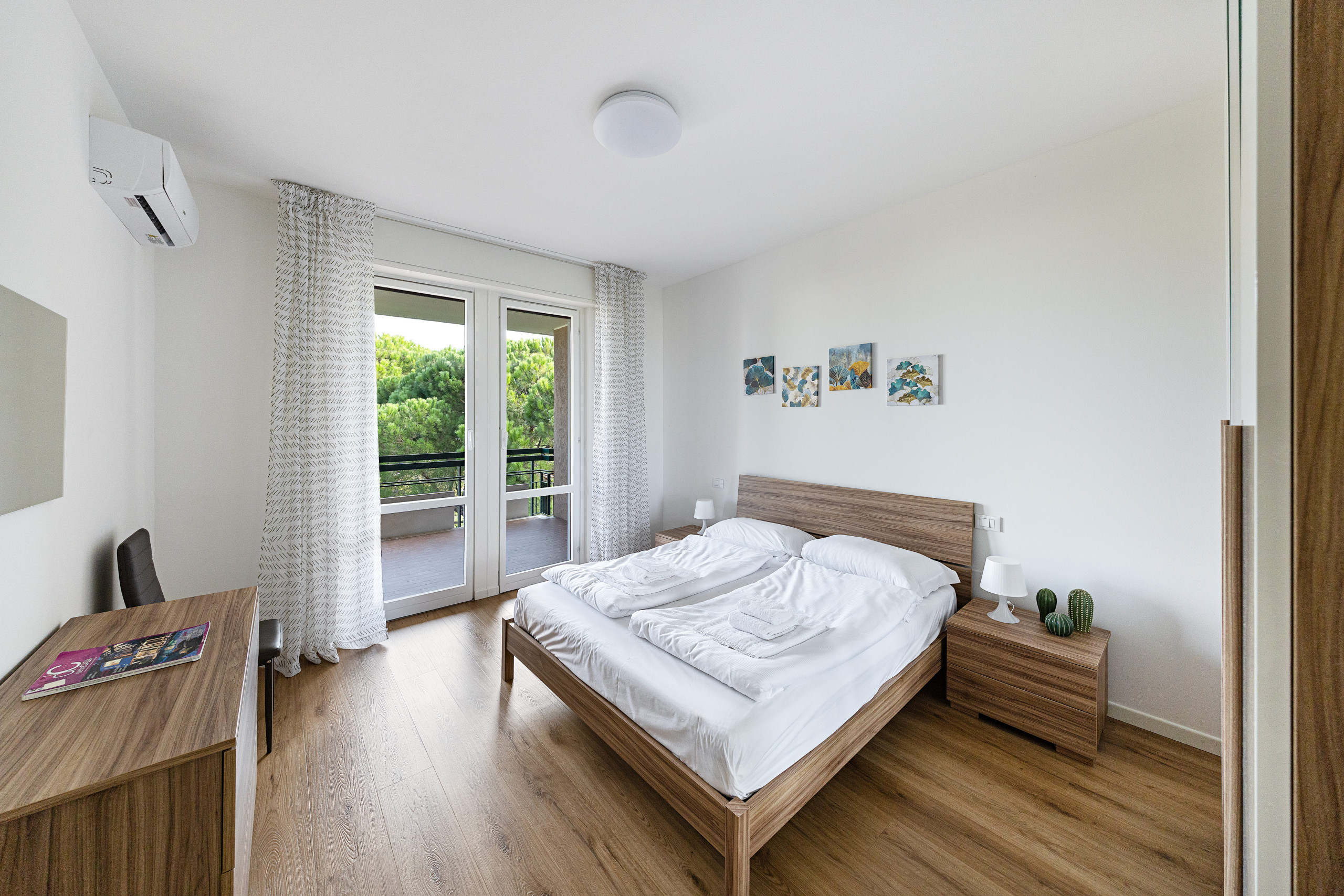 Der Schlafbereich besteht aus zwei Schlafzimmern: das erste mit Doppelbett, Kleiderschrank und privatem Balkon, das zweite ebenfalls mit Doppelbett und Kleiderschrank.