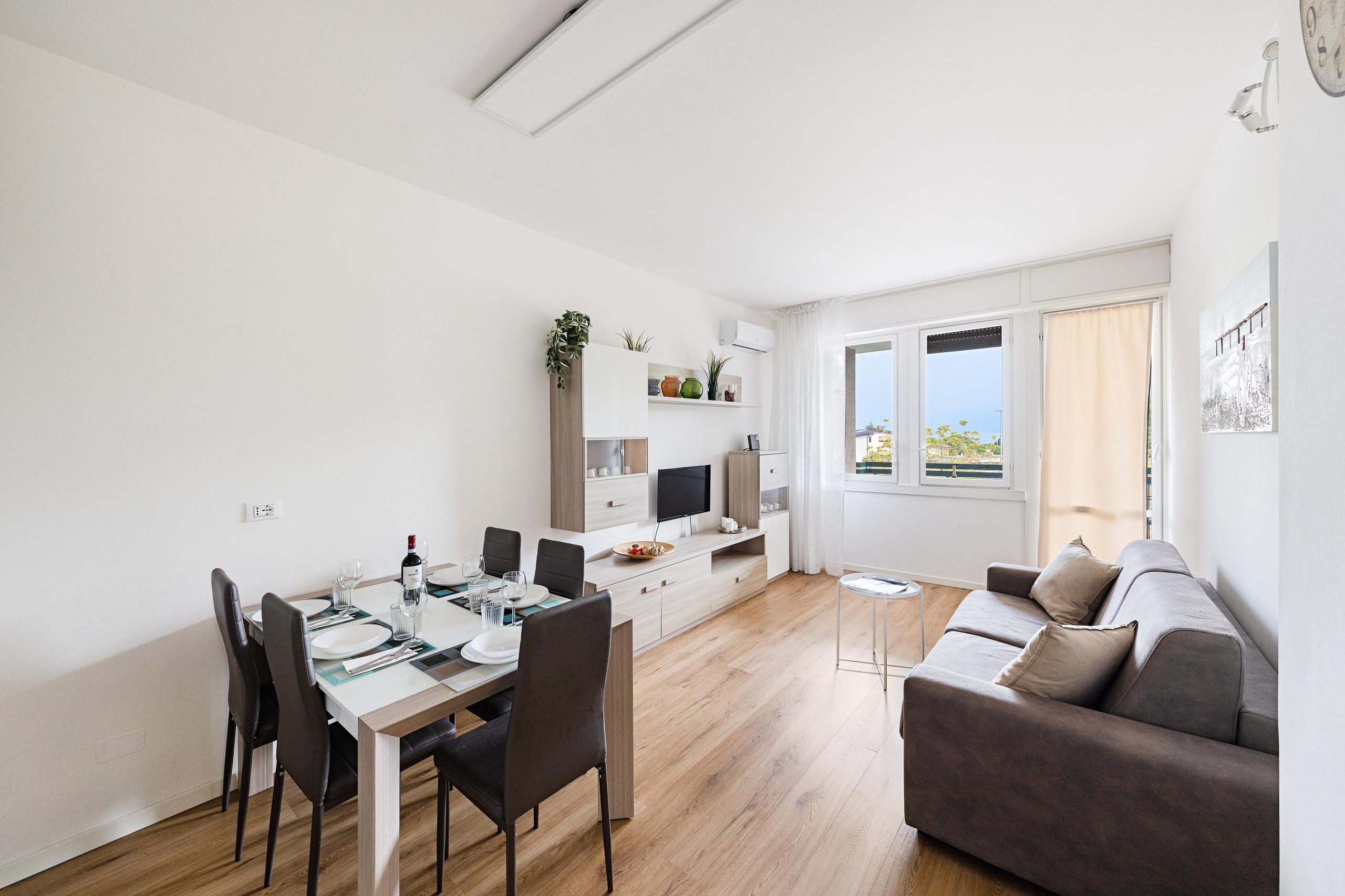 Das Apartment befindet sich im zweiten Stock des Gebäudes mit Aufzug und empfängt die Gäste mit einem großen und hellen Wohnzimmer, ausgestattet mit einem Doppelschlafsofa, Smart-TV, Esstisch mit Stühlen und einer offenen Küche mit Induktionskochfeld, Kühlschrank, Gefrierschrank, Geschirrspüler, Backofen, amerikanischer Kaffeemaschine, Toaster, Wasserkocher und Mikrowelle. Eine Fenstertür führt auf die Terrasse, die mit Tisch und Stühlen ausgestattet ist – ideal, um Mahlzeiten im Freien zu genießen.