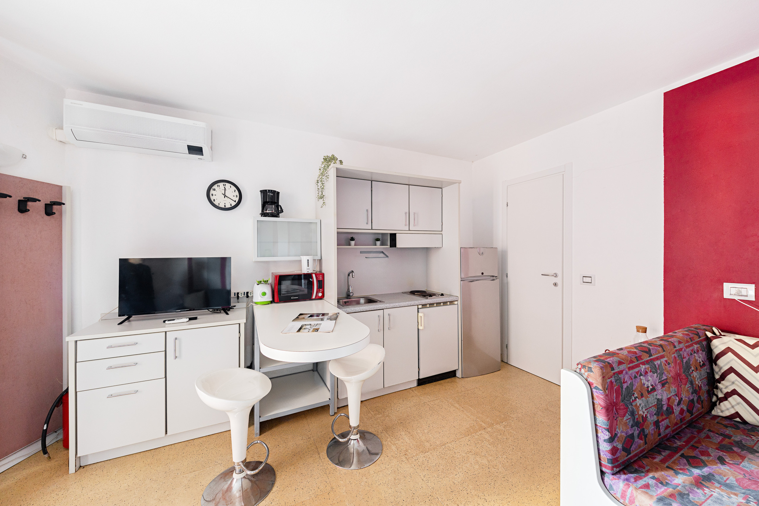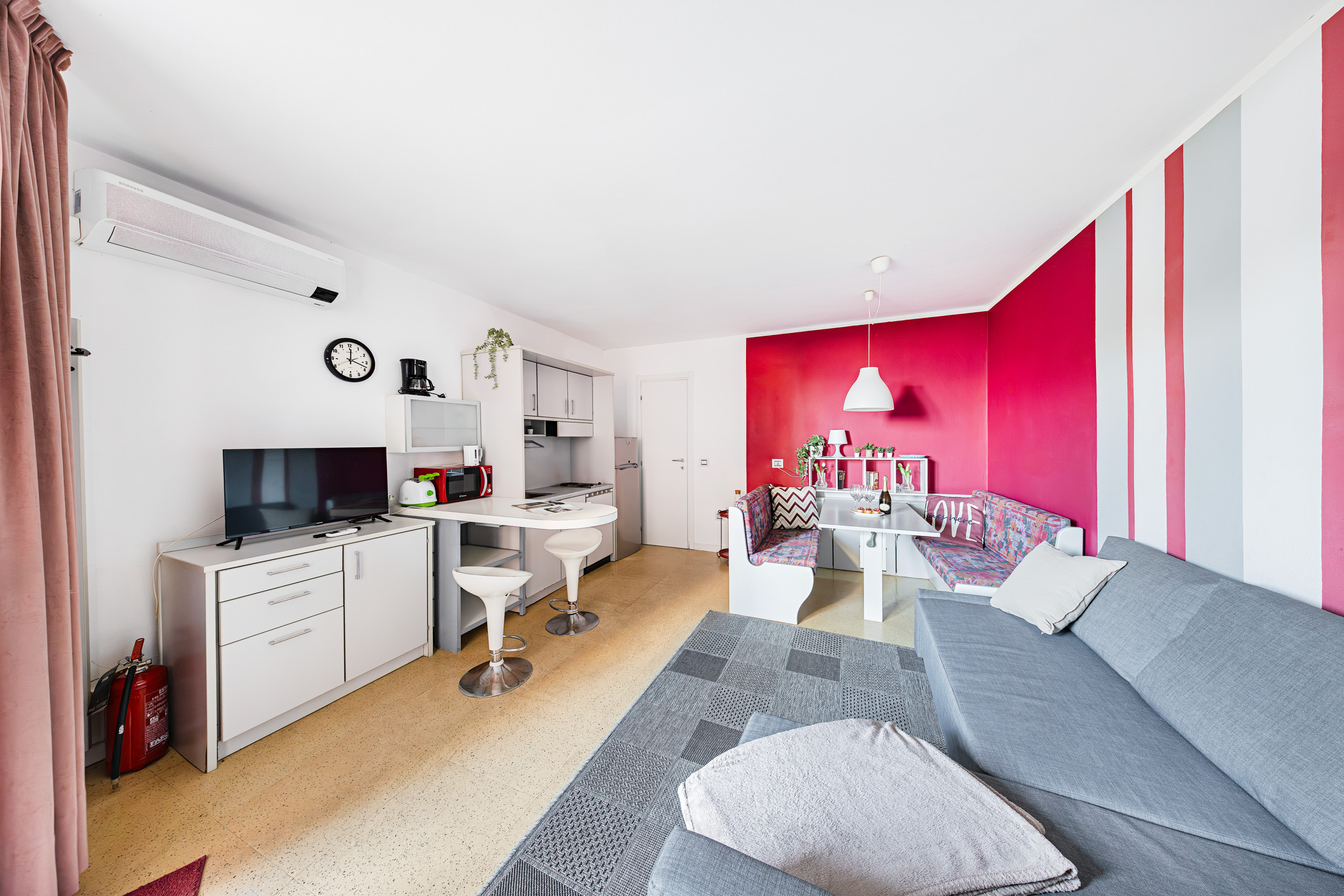 Das Apartment, ausgestattet mit kostenfreiem WLAN und Klimaanlage in allen Zimmern, empfängt die Gäste mit einem Wohnzimmer mit Schlafsofa für zwei Personen, Esstisch mit Stühlen, Smart-TV und offener Küche, die über Induktionskochfeld, Mikrowelle, Kühlschrank, Gefrierschrank, Kaffeemaschine, Wasserkocher und Toaster verfügt. Das Wohnzimmer führt auf einen überdachten Balkon mit Gartentisch, von dem aus man einen wunderschönen Blick auf den See und den Park der Residenz genießen kann.