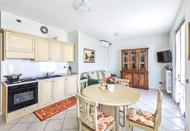 Der Eingang öffnet sich zu einem hellen Wohnzimmer, elegant eingerichtet und mit liebevollen Details ausgestattet. Es verfügt über ein Doppelschlafsofa, einen Esstisch und einen Flachbildfernseher mit italienischen Kanälen. Von hier aus gelangt man auf eine kleine Terrasse mit Esstisch – perfekt, um an sonnigen Tagen am See im Freien zu essen.