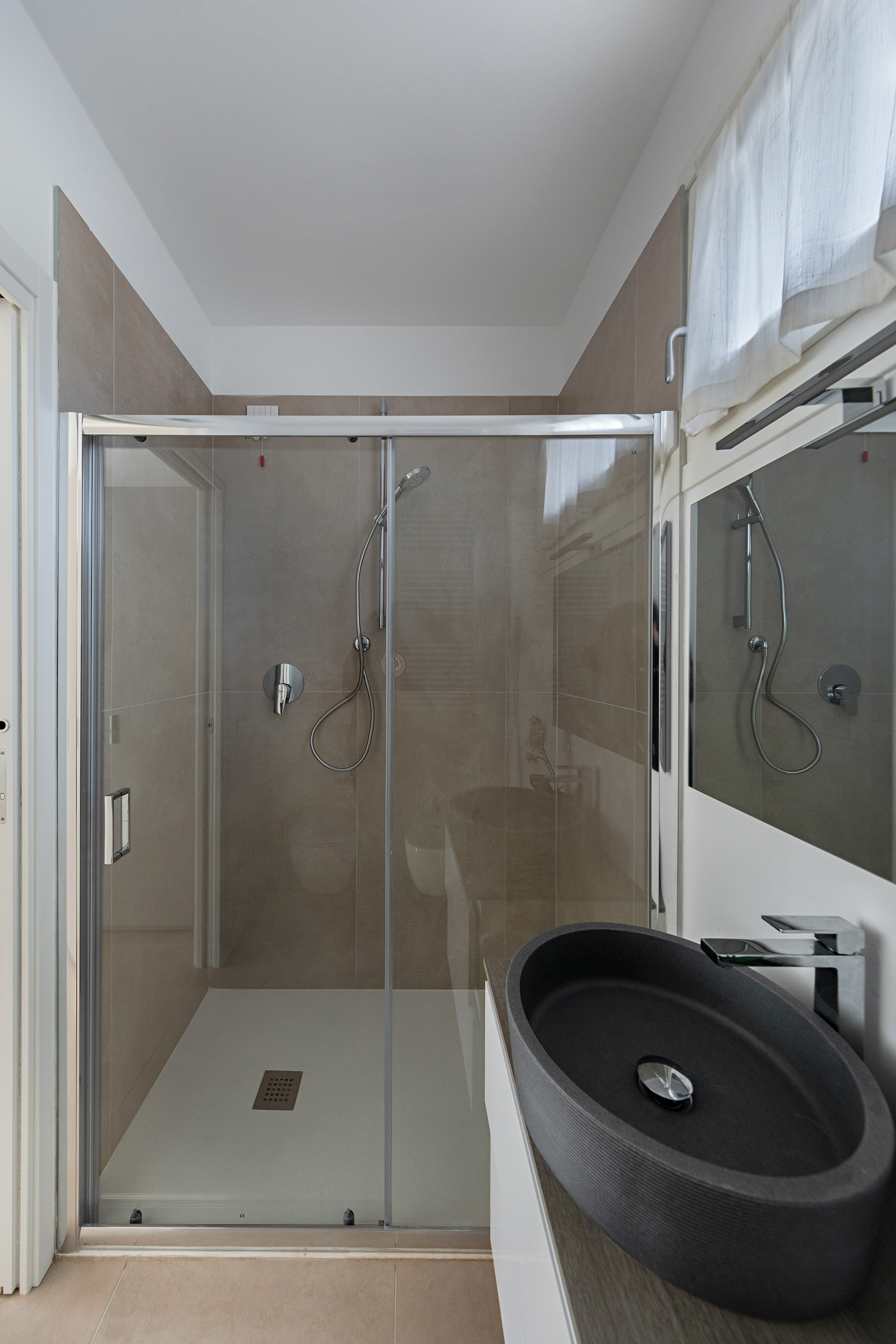 Der Schlafbereich besteht aus drei Schlafzimmern. Die Master-Suite verfügt über ein Doppelbett, einen geräumigen Kleiderschrank und ein eigenes Badezimmer mit Dusche. Das zweite Schlafzimmer bietet ebenfalls ein Doppelbett und einen Schrank und hat Zugang zum Badezimmer im Erdgeschoss mit Dusche, Waschbecken, Bidet und WC. Im Obergeschoss befindet sich das dritte Doppelzimmer mit begehbarem Kleiderschrank, eigenem Bad mit Dusche und direktem Zugang zur privaten Sonnenterrasse der Villa.