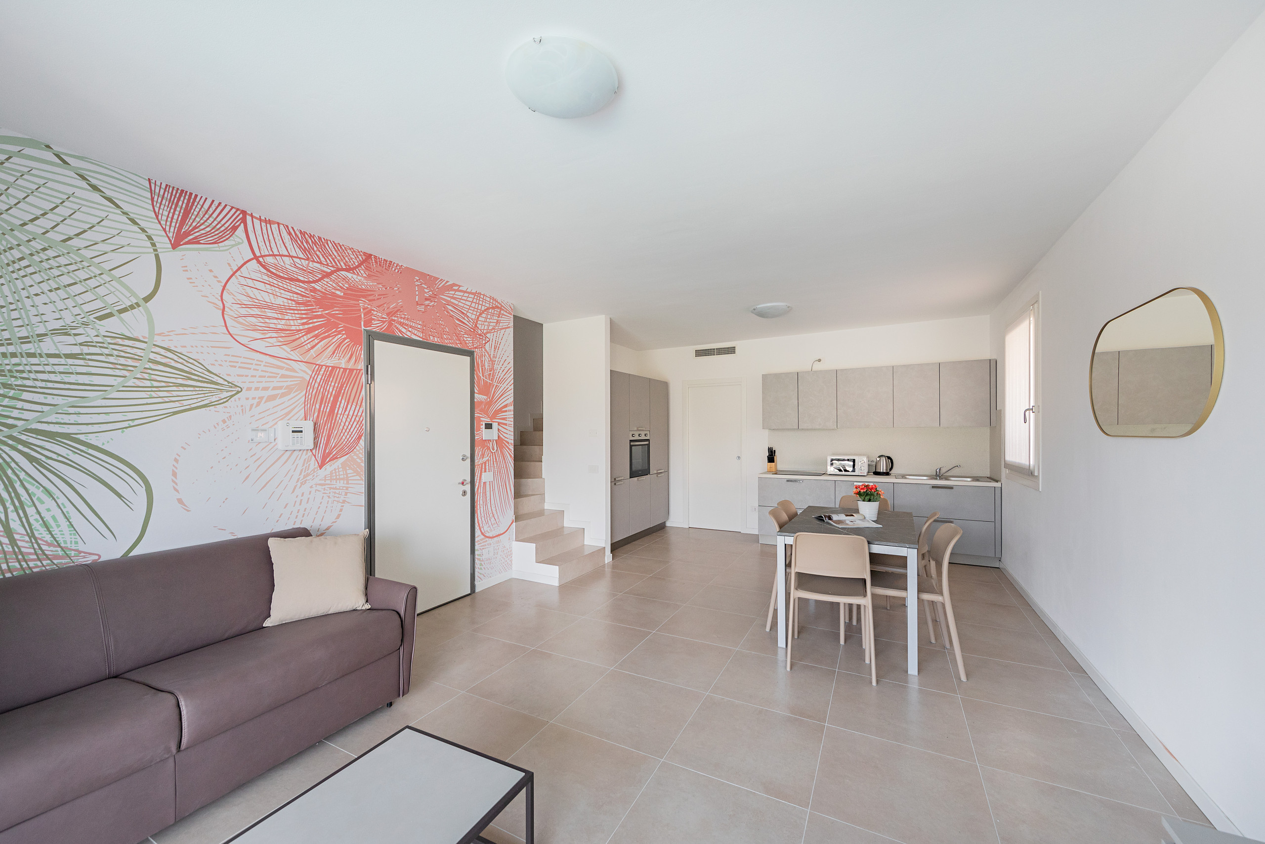 Diese bezaubernde Unterkunft empfängt die Gäste in einem geräumigen und hellen Wohnzimmer, eingerichtet mit einem komfortablen Doppelschlafsofa, Esstisch mit Stühlen, Smart-TV und einer modernen offenen Küche, die komplett ausgestattet ist mit Backofen, Mikrowelle, Geschirrspüler, Wasserkocher, Entsafter, Toaster und amerikanischer Kaffeemaschine.