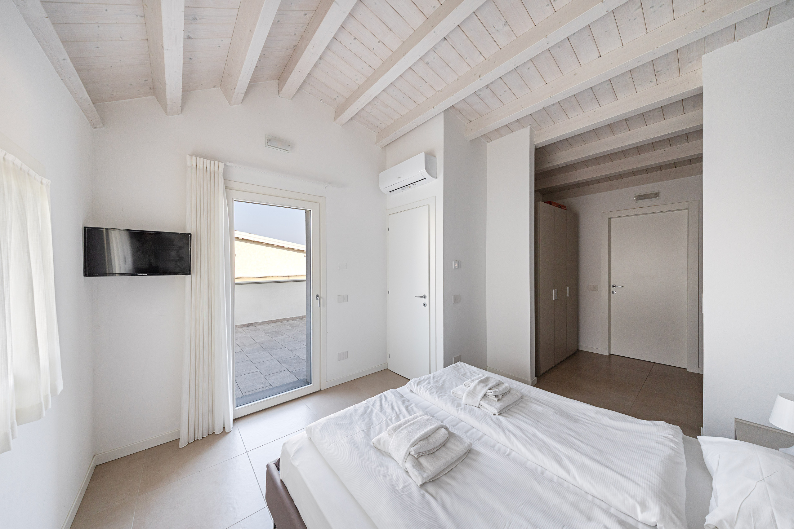 Der Schlafbereich besteht aus drei Schlafzimmern. Die Hauptsuite verfügt über ein Doppelbett, einen geräumigen Kleiderschrank und ein eigenes Badezimmer mit Dusche, Waschbecken, Bidet und WC. Das zweite Schlafzimmer bietet ebenfalls ein Doppelbett und einen Kleiderschrank und hat Zugang zum Badezimmer im Erdgeschoss, ausgestattet mit Dusche, Waschbecken, Bidet und WC. Im Obergeschoss befindet sich das dritte Doppelzimmer, mit Flachbild-TV, begehbarem Kleiderschrank, eigenem Badezimmer mit Dusche, Waschbecken, Bidet und WC sowie direktem Zugang zur privaten Dachterrasse der Villa.