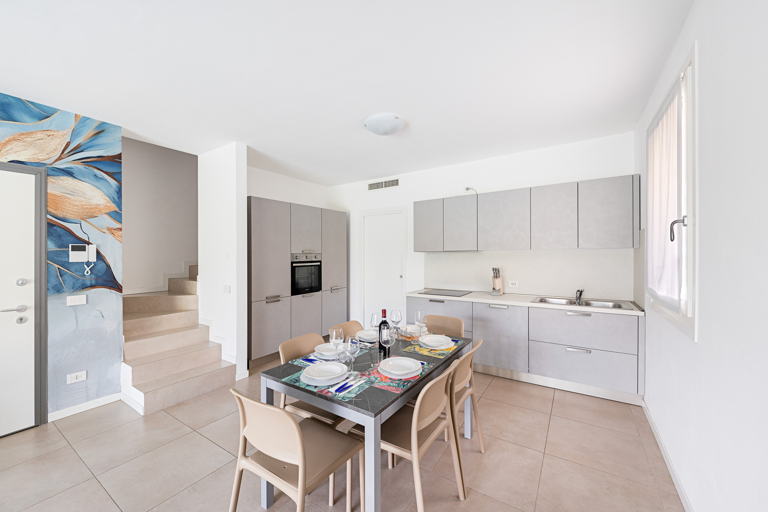 Diese charmante Unterkunft empfängt die Gäste in einem großzügigen und hellen Wohnzimmer, ausgestattet mit einem bequemen Doppelschlafsofa, Esstisch mit Stühlen, Smart-TV und einer modernen, offenen Küche mit kompletter Ausstattung: Backofen, Mikrowelle, Geschirrspüler, Wasserkocher, Zitruspresse, Toaster und amerikanische Kaffeemaschine.