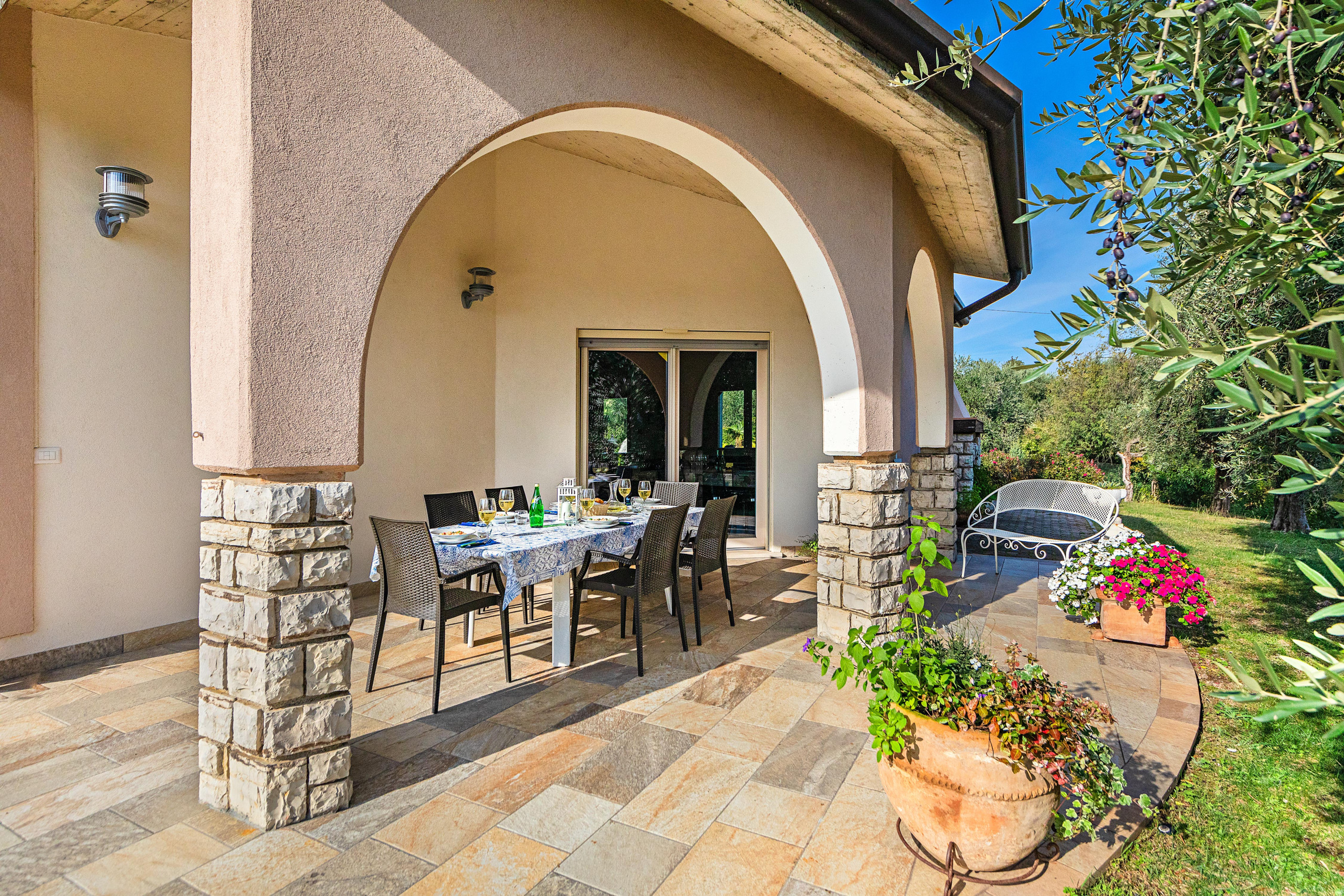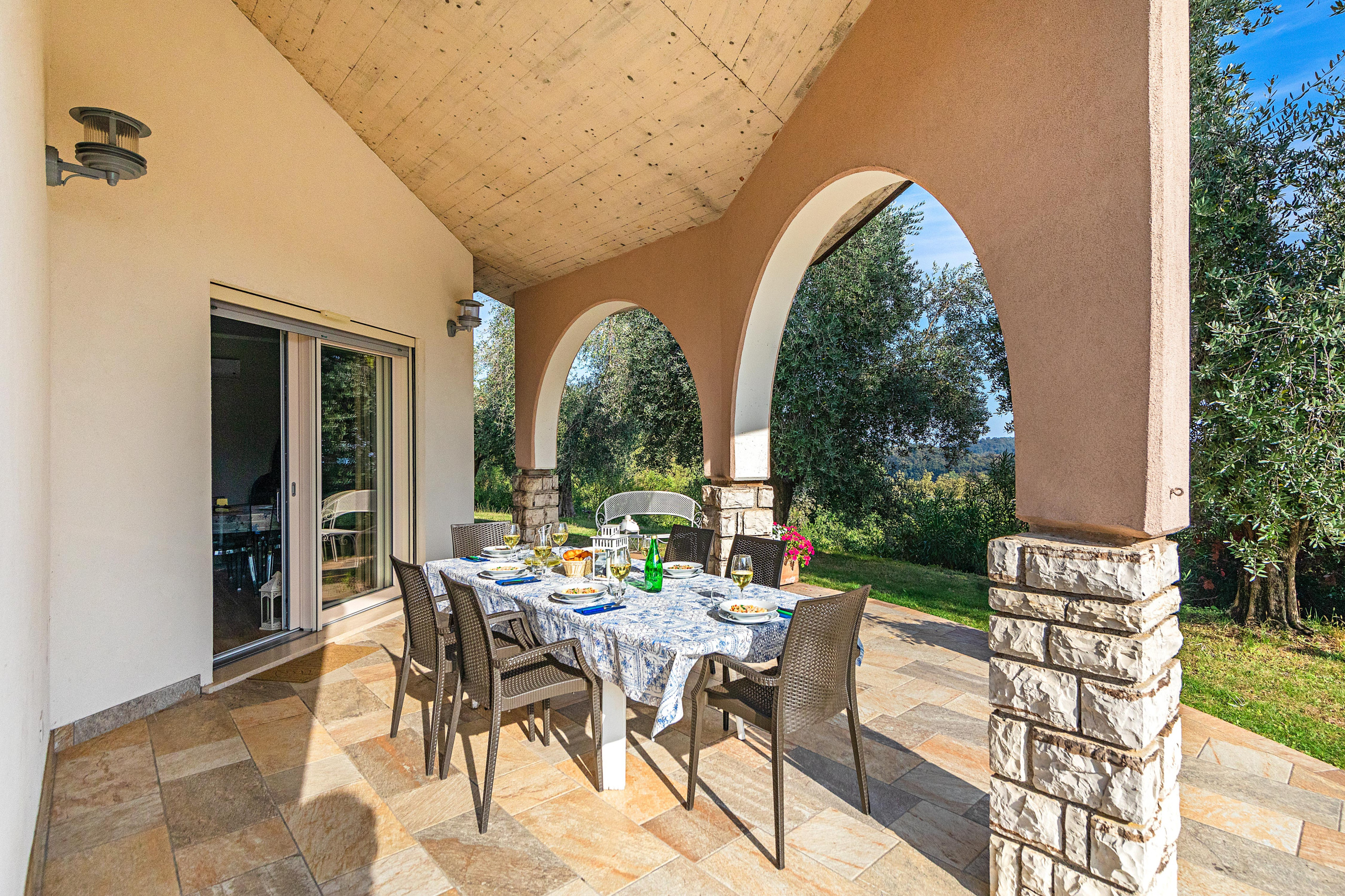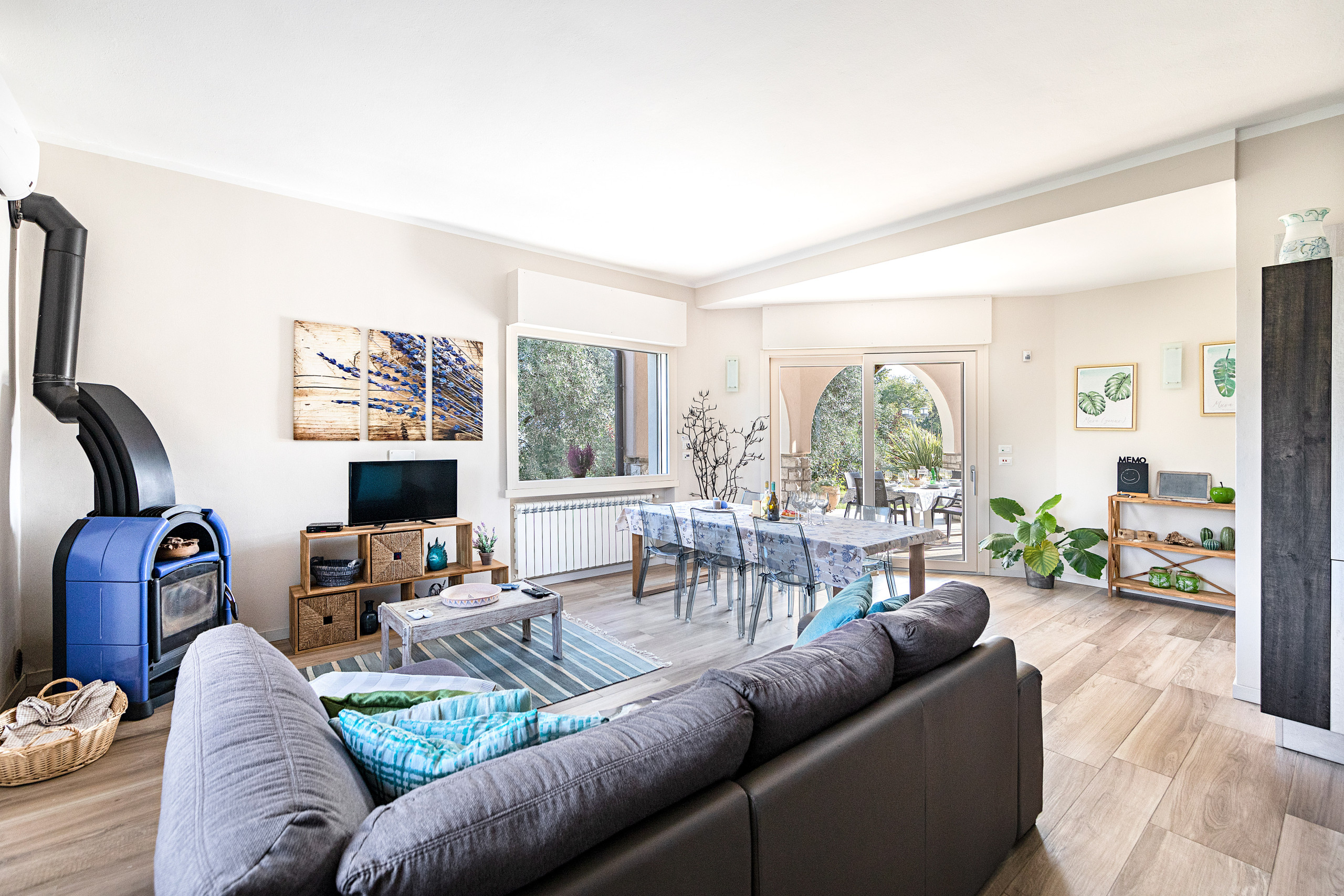 Beim Betreten werden die Gäste von einem hellen und großzügigen Wohnzimmer empfangen, ausgestattet mit einem Doppelschlafsofa, Satelliten-TV mit internationalen Kanälen, Essbereich und einer modernen, voll ausgestatteten Küche: Gasherd, Kühlschrank mit Gefrierfach, traditioneller Backofen und Mikrowelle, Geschirrspüler, Wasserkocher, Zitruspresse, Kaffeemaschine und Toaster. Die Villa ermöglicht es den Gästen, sowohl drinnen als auch draußen bequem zu essen, dank des Esstisches im Innenbereich und des Essbereichs unter der überdachten Veranda, von der aus man den Pool, den Garten und den Blick auf den See genießen kann.