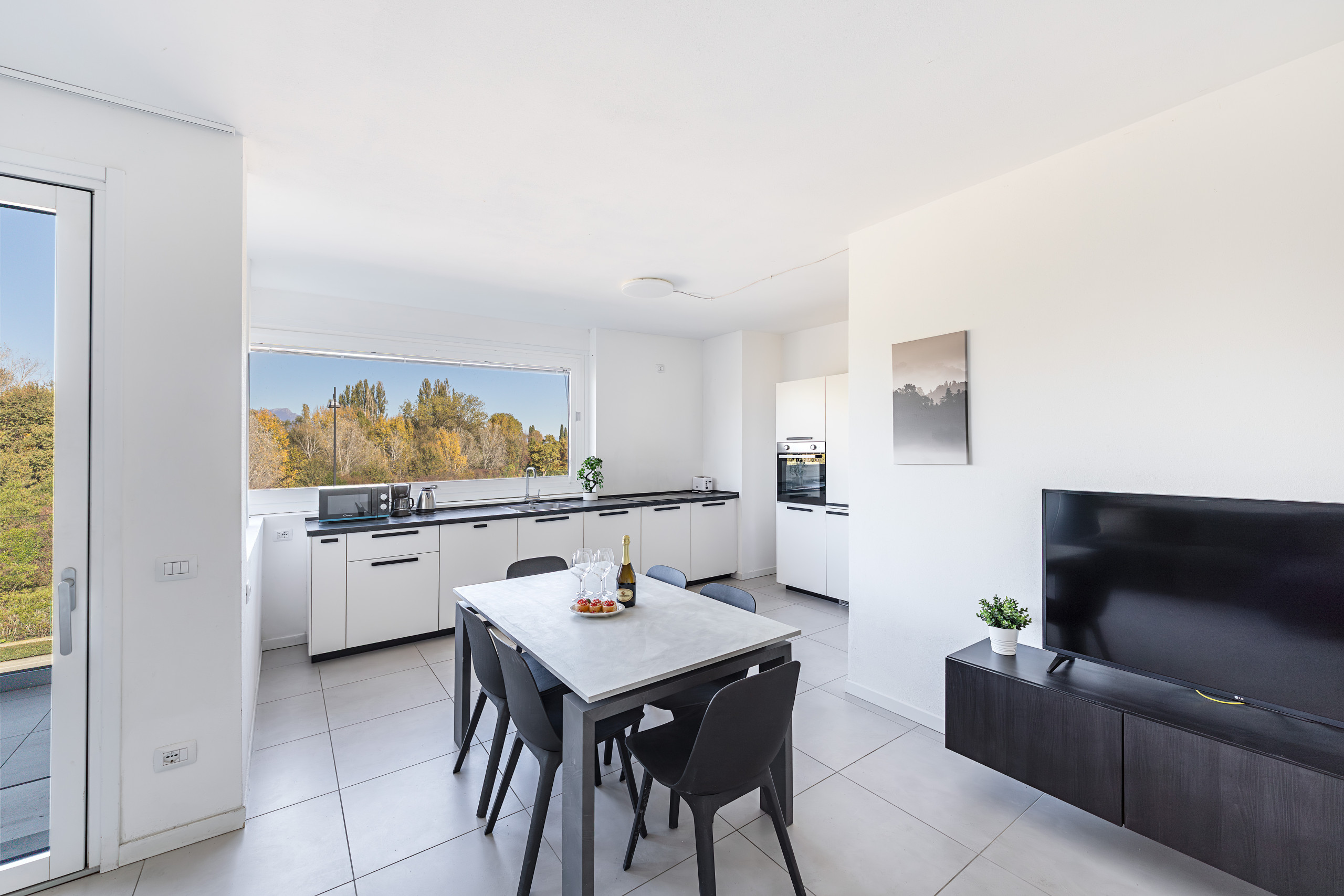 The apartment, located on the second floor of a building with elevator, welcomes guests with a large and bright living room featuring a double sofa bed, Smart TV, dining table with chairs, and an open-plan kitchen fully equipped with induction hob, refrigerator, freezer, dishwasher, oven, American coffee machine, toaster, kettle and microwave. A French door provides access to the furnished terrace with table and chairs, perfect for enjoying meals outdoors.
