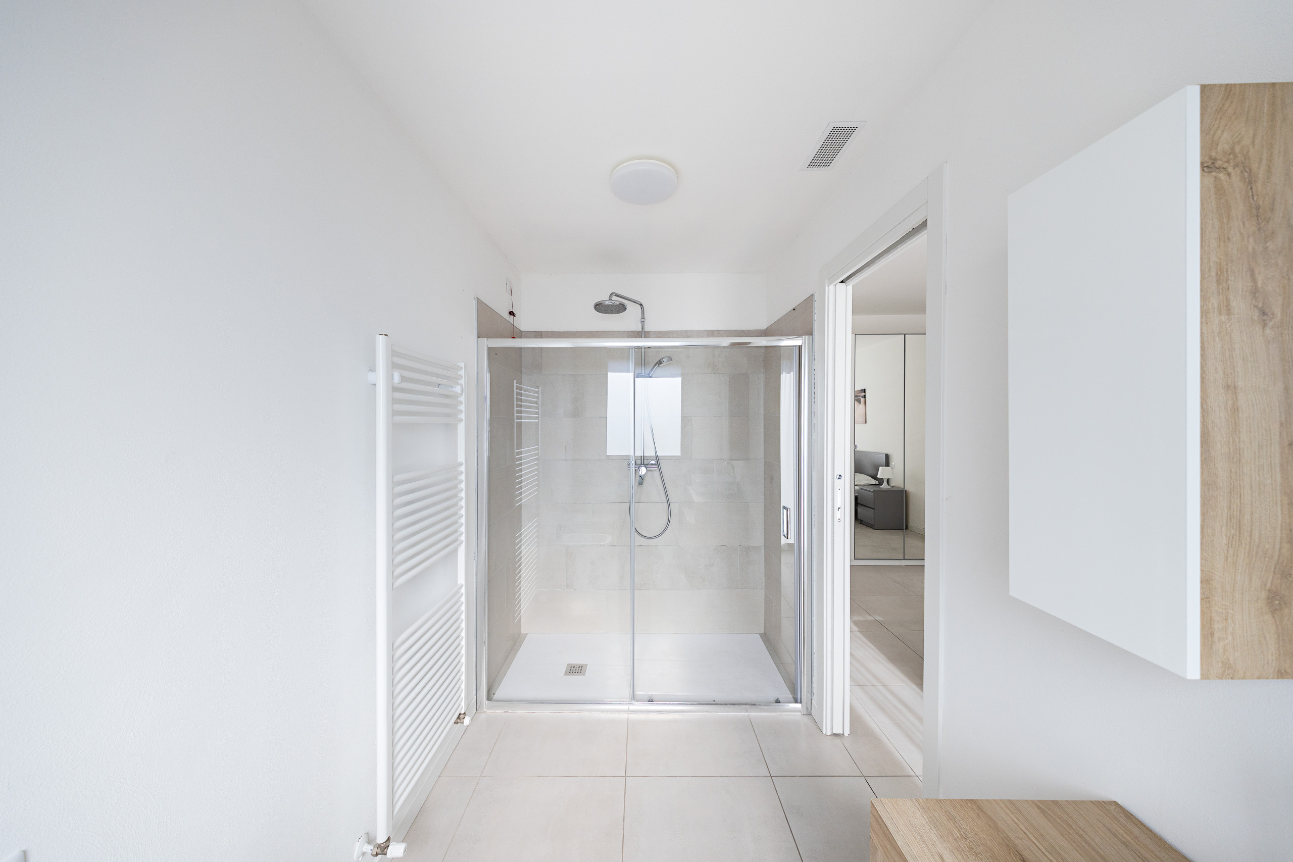 The bathroom with shower, washbasin, bidet, and WC completes the layout of this wonderful apartment.
