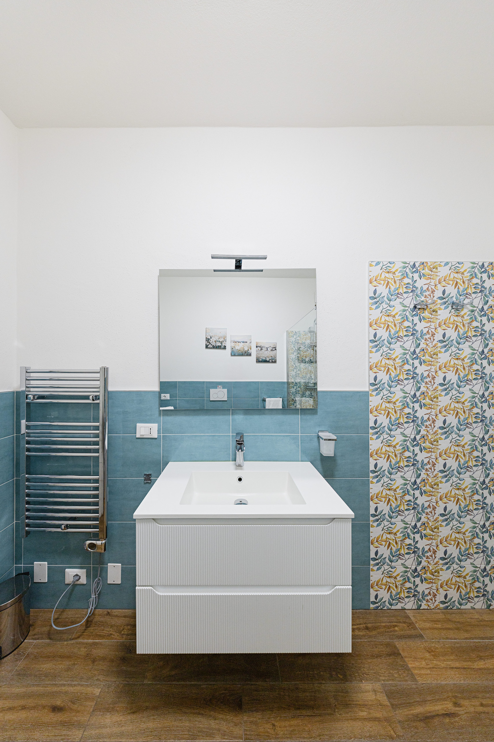 The bathroom with shower, washbasin, bidet, and WC completes the layout of this wonderful apartment.