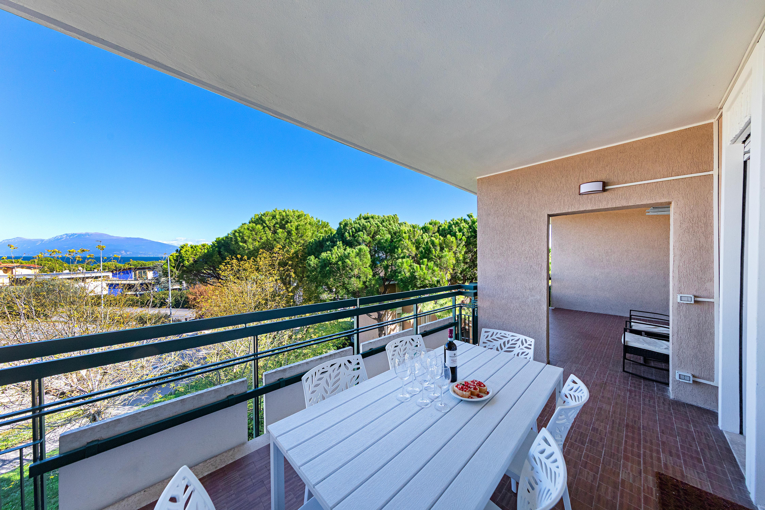 The apartment, located on the second floor of a building with an elevator, welcomes guests with a living room furnished with a Smart TV, a comfortable double sofa bed, a dining table with chairs, and a fully equipped kitchen featuring an induction cooktop, refrigerator, freezer, oven, microwave, electric kettle, coffee machine, and toaster. Through a French door, you can access the covered terrace furnished with an outdoor table and chairs, where you can enjoy a beautiful lake view.