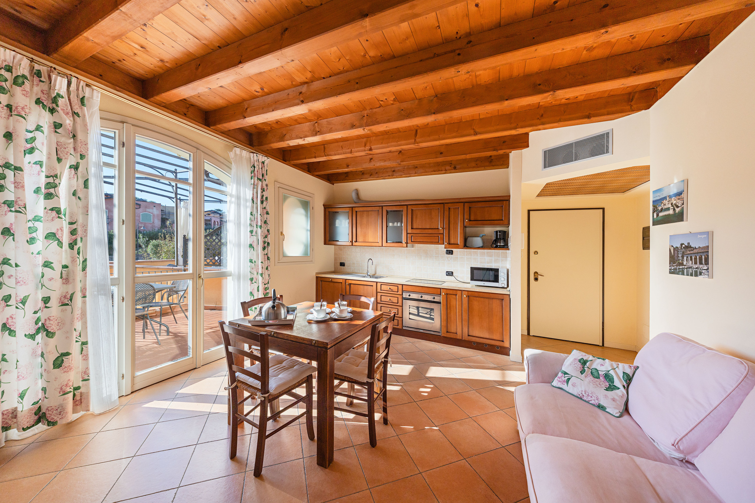 The apartment, equipped with free Wi-Fi internet connection and air conditioning in all rooms, welcomes guests with a living room featuring a sofa bed for two, dining table with chairs, Smart TV, and an open-plan kitchen complete with induction hob, microwave, fridge, freezer, coffee machine, electric kettle, and toaster. The living room opens onto a covered balcony with outdoor table, from which you can enjoy a wonderful view of the lake and the residence’s park.