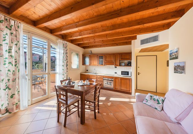 Modern apartment in Manerba del Garda, inside the “San Sivino” Residence with swimming pool, playground, and direct access to the beach and the lake.