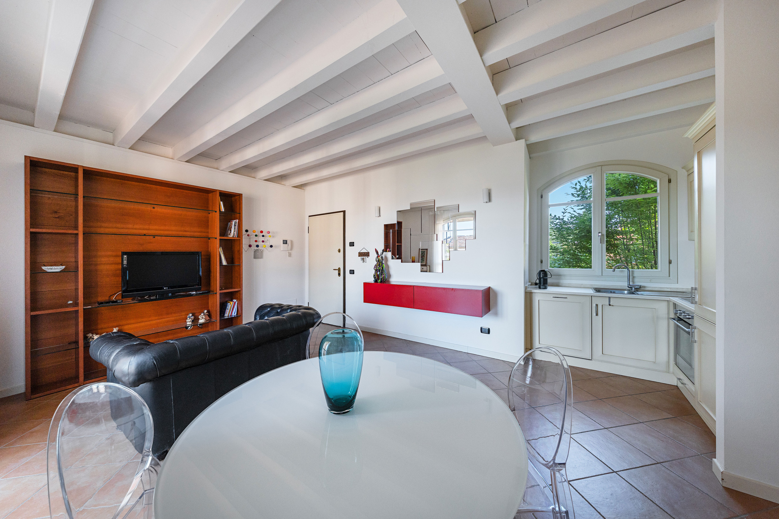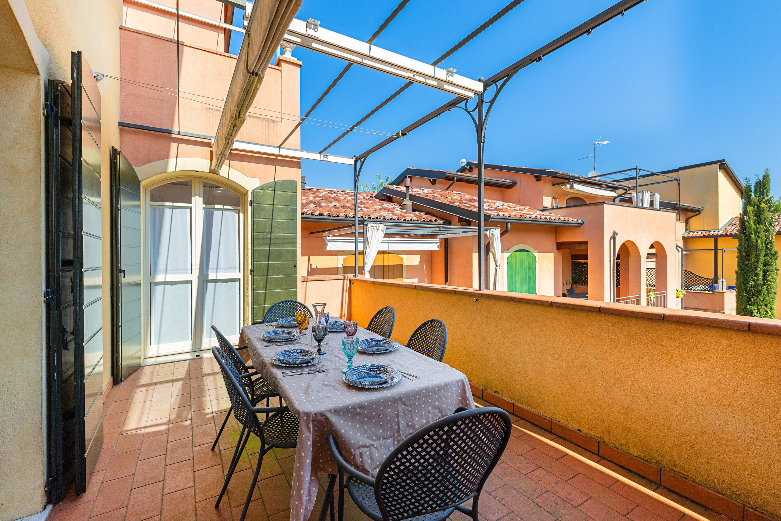 From the living room you access the terrace, furnished with a dining table for six and sun awning, ideal for outdoor meals with a pleasant view of the residence’s pool and the surrounding hills.