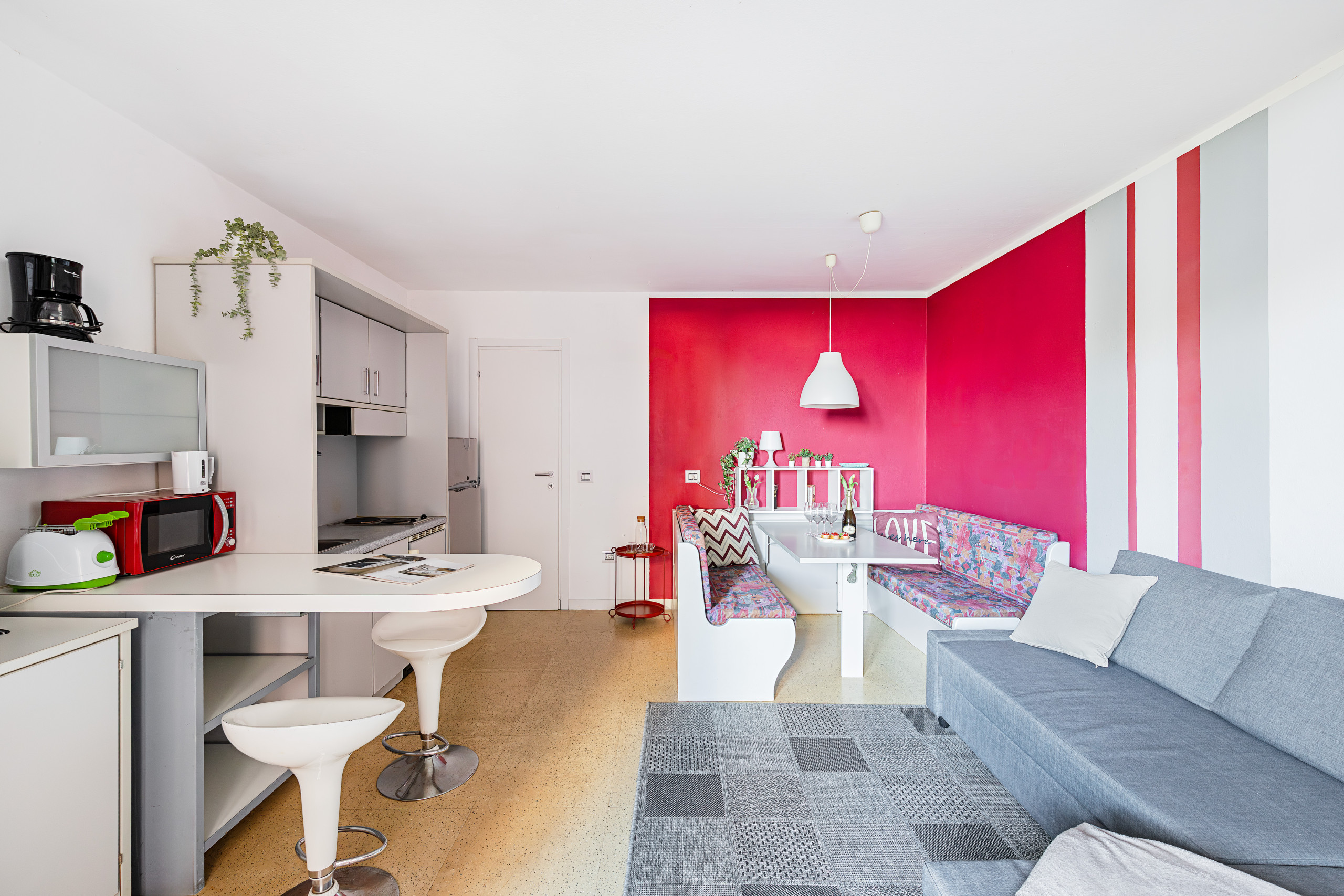 The apartment also includes a bedroom with a comfortable double bed and wardrobe, and a bathroom with shower, sink, bidet, WC, and washing machine.