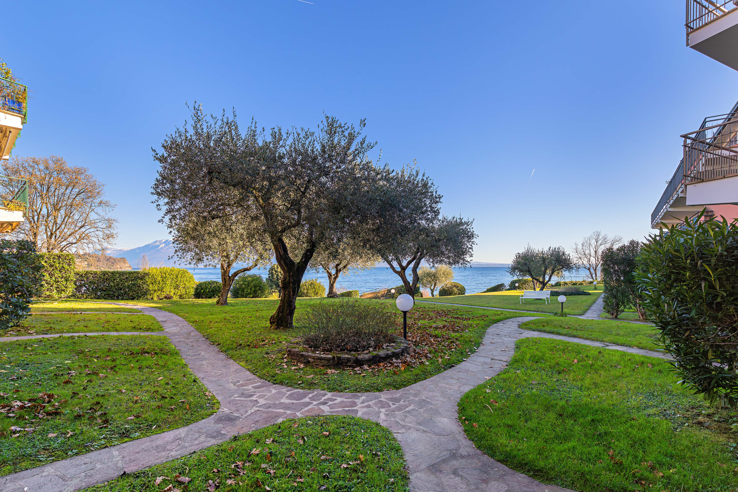 Modern ground-floor apartment in Manerba del Garda, located within the “San Sivino” Residence, featuring a swimming pool, playground, large shared green areas, and direct access to the beach and the lake.