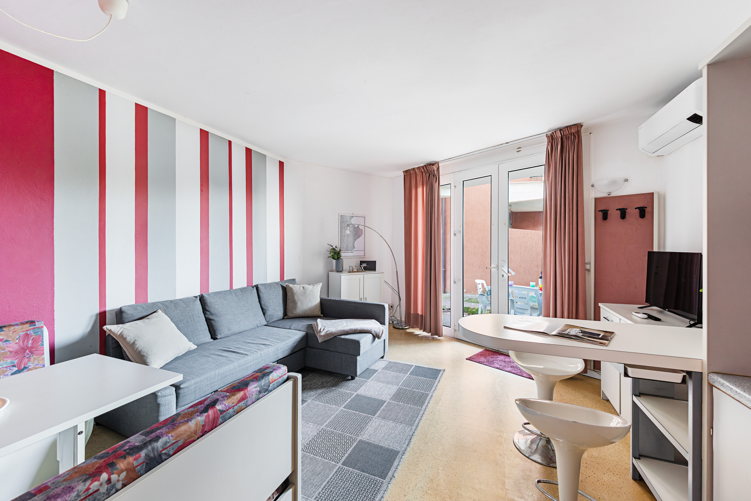 The apartment, equipped with free Wi-Fi internet connection and air conditioning in all rooms, welcomes guests with a living room featuring a sofa bed for two, dining table with chairs, Smart TV, and an open-plan kitchen complete with induction hob, microwave, fridge, freezer, coffee machine, electric kettle, and toaster. The living room opens onto a covered balcony with outdoor table, from which you can enjoy a wonderful view of the lake and the residence’s park.