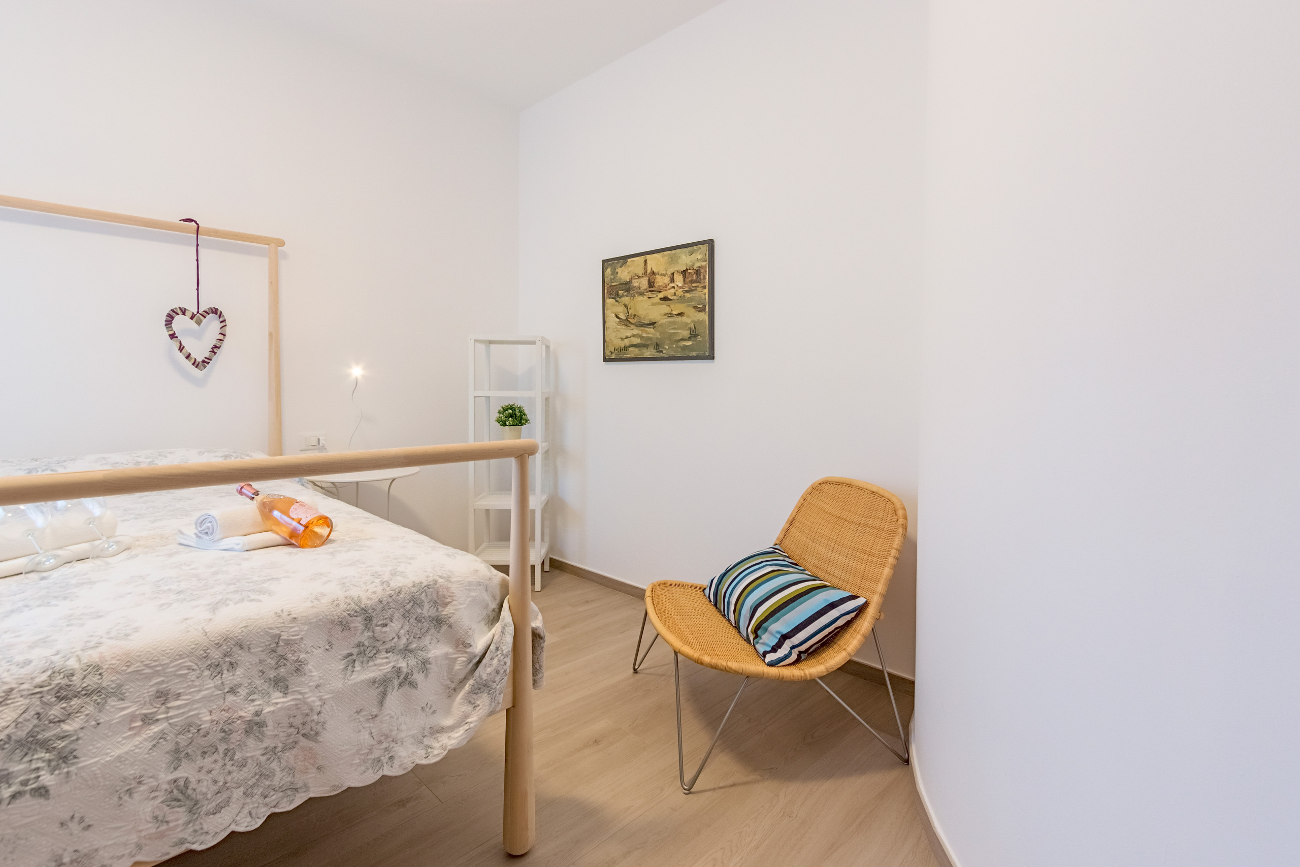 The living room opens onto a beautiful covered patio with a dining table and chairs for 6 people; the apartment also boasts a private garden with synthetic grass.