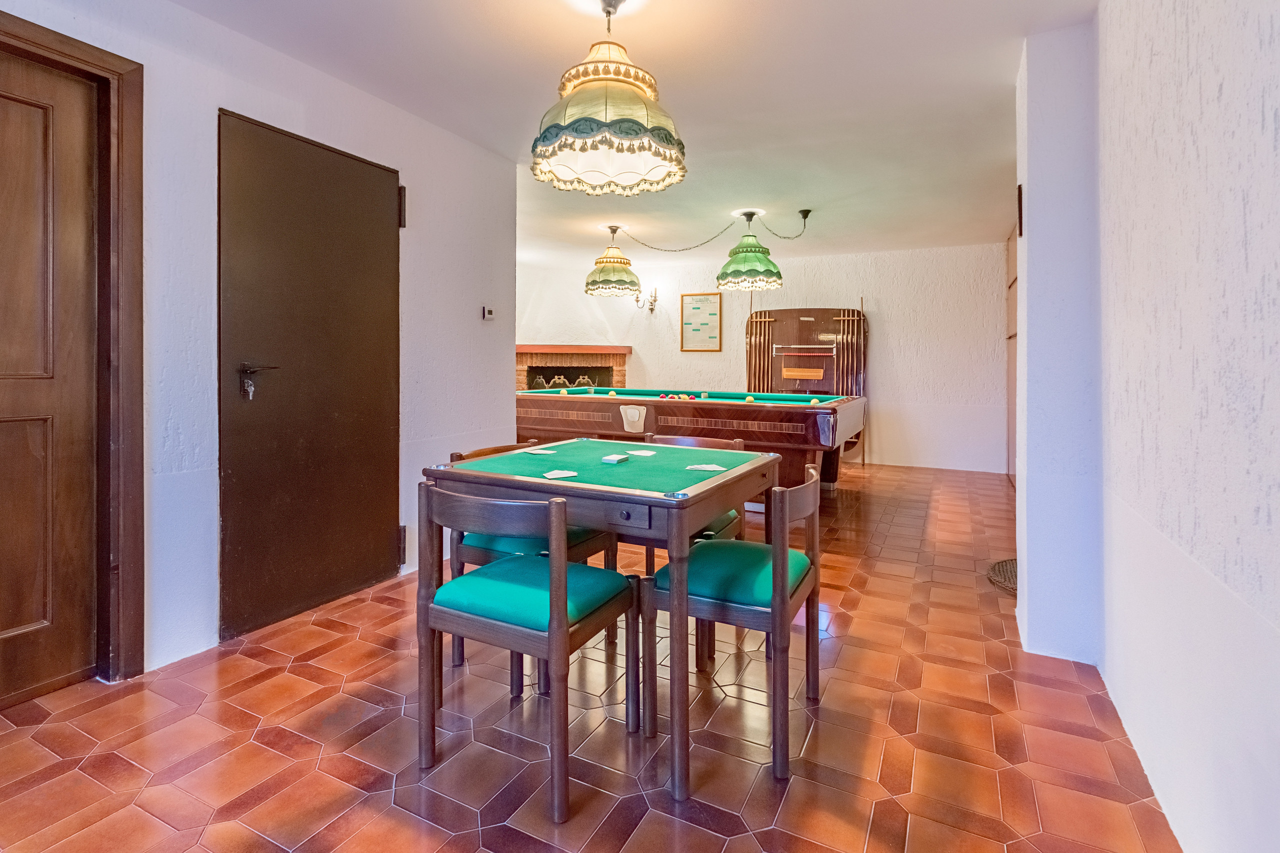 An internal staircase leads to the basement, which includes a spacious game room with a pool table, a large dining area for social gatherings, and a bathroom with shower, washbasin, and toilet.