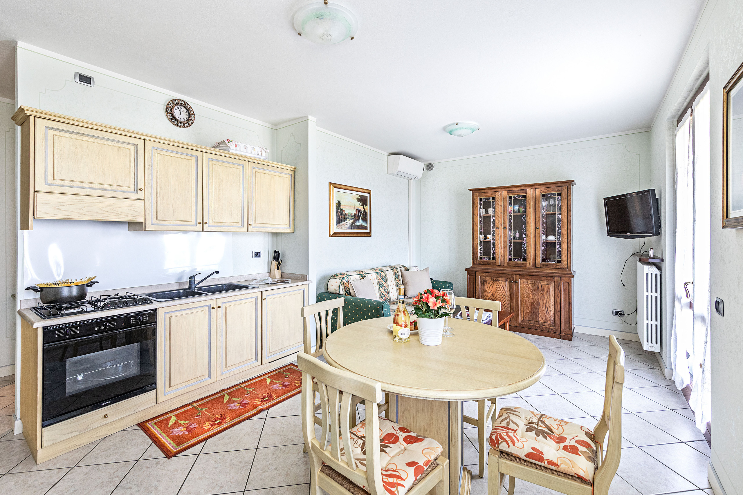 The entrance opens onto a bright living room, elegantly furnished and enriched with fine details. It features a double sofa bed, a dining table, and a flat-screen TV with Italian channels only. From here, you can access a small terrace equipped with a dining table — perfect for enjoying outdoor meals on sunny days by the lake.