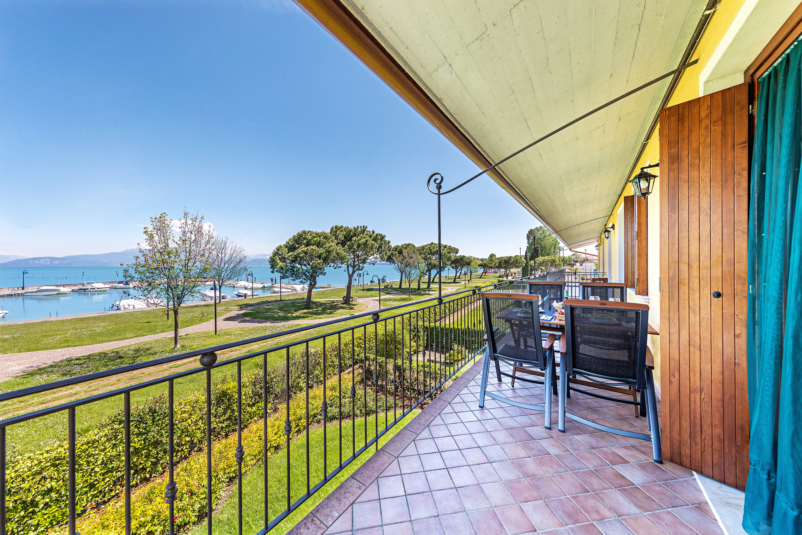 The living room opens onto a large private terrace with a wonderful lake view, equipped with an outdoor dining table and chairs for al fresco meals.