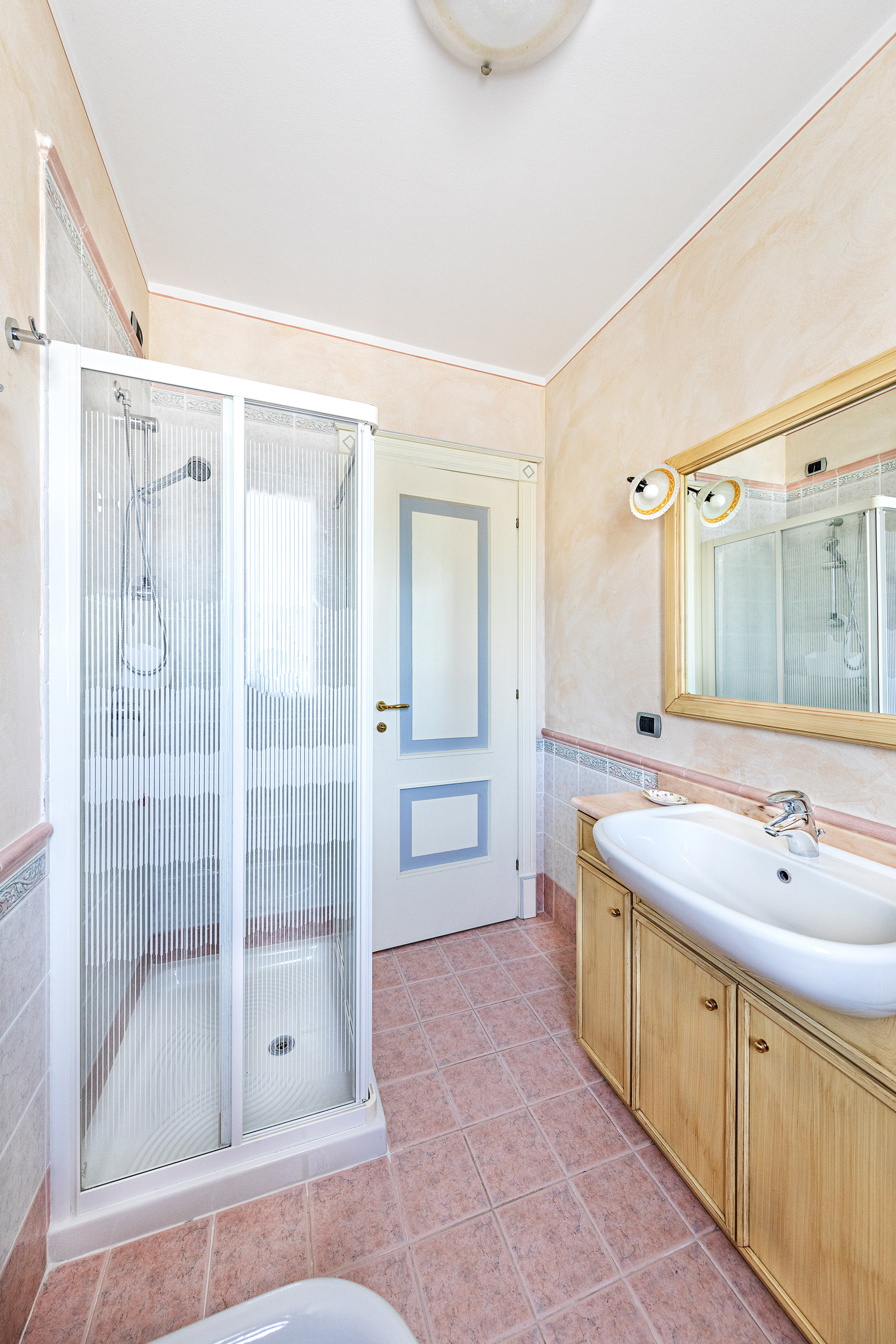 The bathroom, complete with a large shower, sink, bidet, and toilet, completes the apartment.